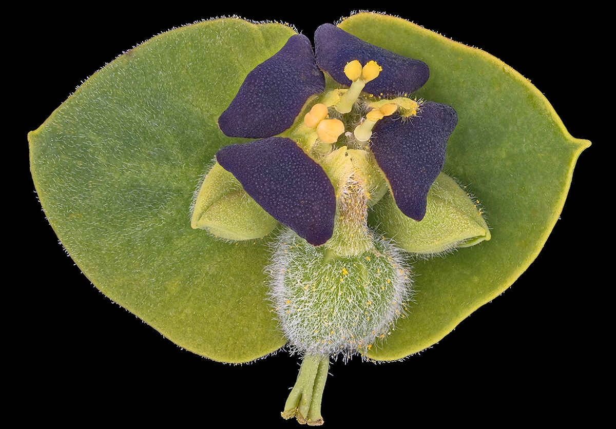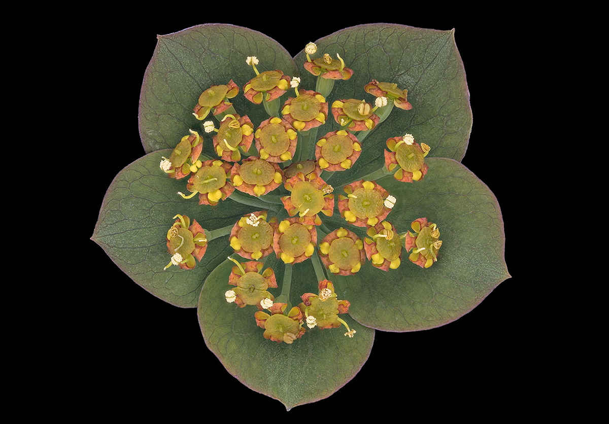 Bei Wolfsmilchgewächsen (hier eine Palisaden-Wolfsmilch) endet ein Zweig immer mit einem Blütenstand. Die Scheinblüte besteht aus einer weiblichen und mehreren männlichen Blüten. Unten ist der Stempel und darüber der Fruchtknoten zu sehen, ebenfalls sieht man mehrere Staubbeutel, die vier schwarzen «Taschen» sind Honigdrüsen, Blütenblätter sind nicht vorhanden. Nikon D810, Rodenstock Rodagon 1:5.6, f = 105mm (in retro), bei Blende 8, 1.5:1, Stack aus 96 Aufnahmen im Abstand von 0.1mm.