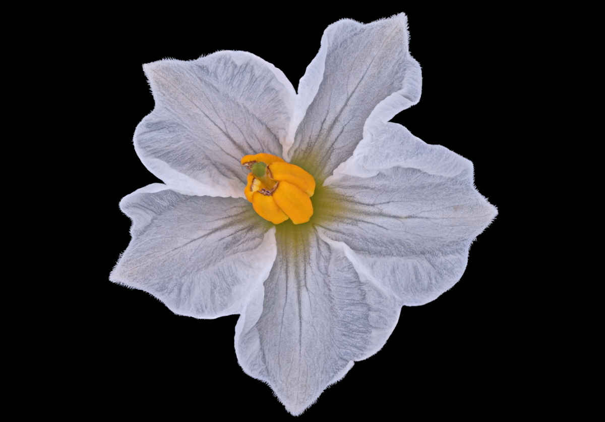 Die Kartoffelblüte stammt von einer ursprünglich exotischen Pflanze, die etwa 1570 erstmals als Zierpflanze nach Europa importiert wurde. Marie-Antoinette (1774 Königin von Frankreich), trug auf festlichen Bällen einen Kranz dieser Blüten im Haar. Ihren botanischen Namen (Solanum tuberosum), erhielt sie 1596 von Caspar Bauhin, Professor für Anatomie in Basel. In Braunlage im Harz, wurde ihr zu ehren, sogar ein Denkmal errichtet. Nikon D810, Rodenstock Rodagon 1:5.6, f = 105mm (in retro), bei Blende 8, 1:1, Stack aus 61 Aufnahmen im Abstand von 0.25mm.