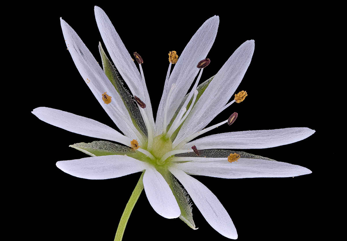 Die Gras-Sternmiere ist relativ stark verbreitet, jedoch ist sie so klein (Durchmesser etwa 1cm) und unscheinbar, dass sie kaum wahrgenommen wird. Nikon D810, Laowa 25mm F 2.8, 2.5-5X Ultra Macro, bei Blende 2.5, 2.5:1, Stack aus 78 Aufnahmen im Abstand von 0.1mm.