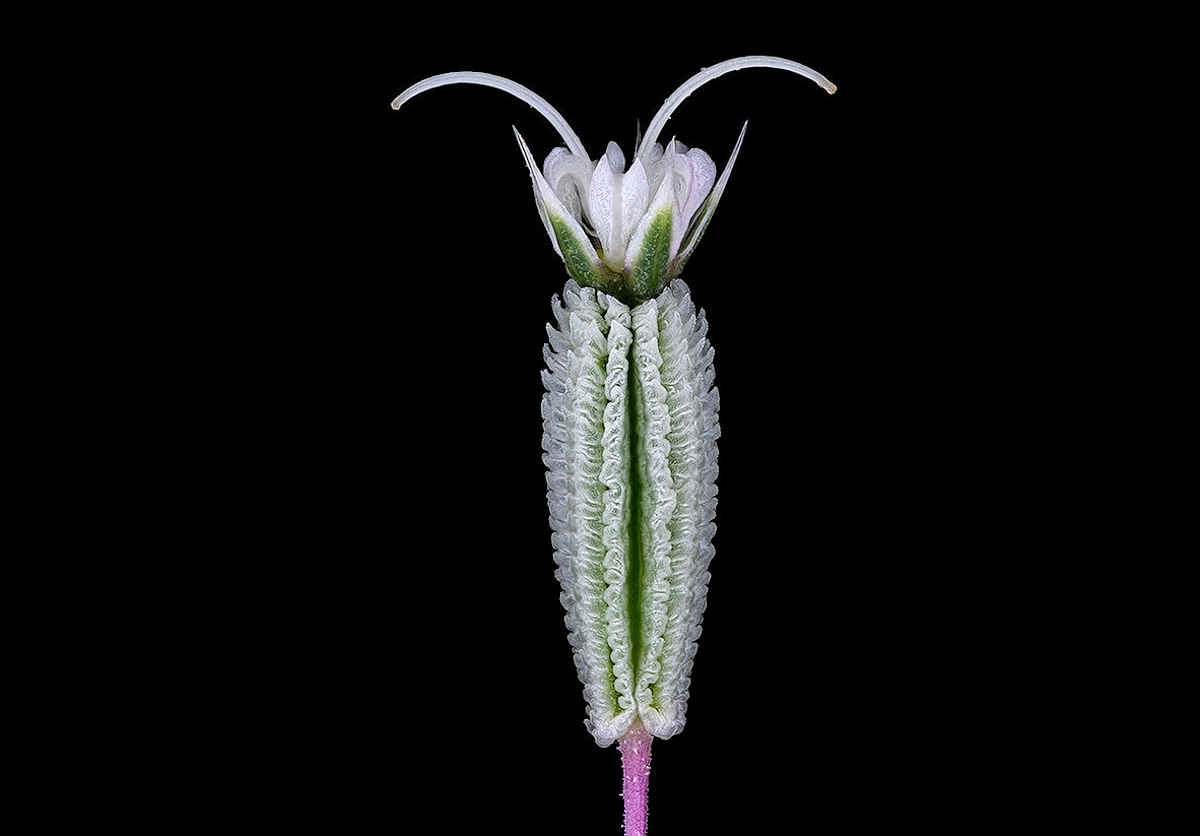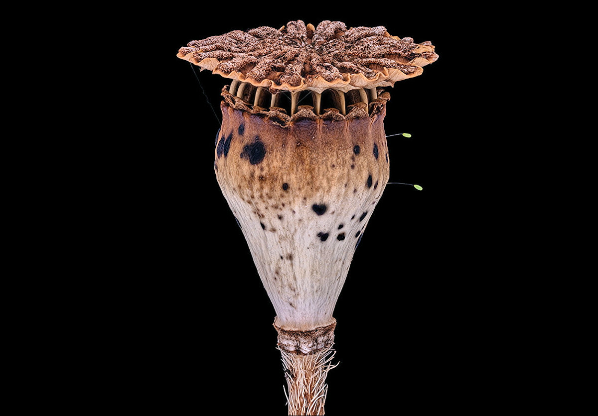 Die grosse Kapsel (Fruchtstand) des Orientalischen Mohn besitzt eine Reihe von Öffnungen, durch welche bei Berührung oder durch Wind, die Samen herausfallen. Die Konstruktion erinnert an Fenster eines Gebäudes von Antoni Gaudi im Park Güell, Barcelona. Auch hier sind auf der rechten Seite, zwei gesielte Eier der Florfliege zu erkennen. Nikon D810, Rodenstock Rodagon 1:5.6, f = 105mm (in retro), bei Blende 8, 1:1.4, Stack aus 92 Aufnahmen im Abstand von 0.3mm.