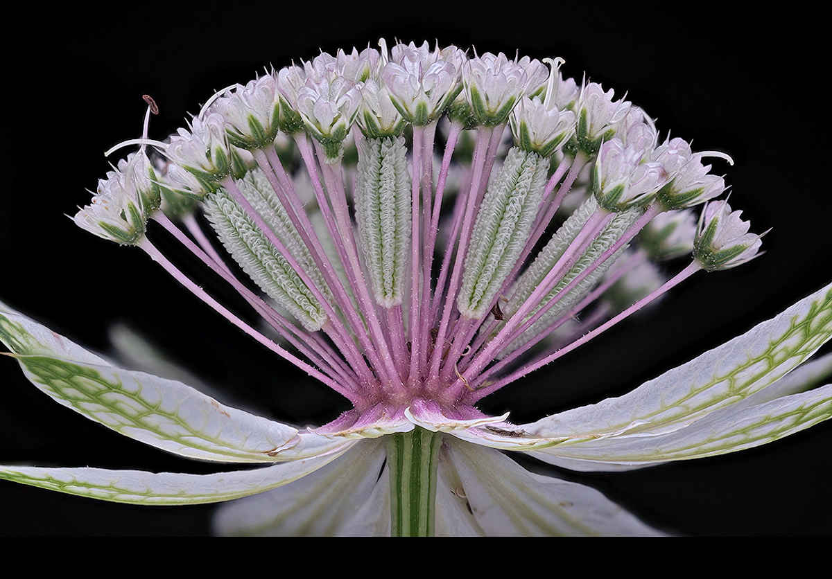 Die Grosse Sterndolde ist in den Alpen häufig anzutreffen. Sie fällt auf, weil sie bis zu zwei Meter hoch werden. Mit ihren grossen, äusseren Blütenblätter sieht sie wie ein Korbblütler aus, ist jedoch ein Doldenblütler, der aus vielen Einzelblüten besteht. Der Durchmesser der Dolde beträgt etwa drei Zentimeter. Nikon D810, Rodenstock APO Rodagon N 1:4, f = 80mm (in retro), bei Blende 8, 1:1, Stack aus 103 Aufnahmen im Abstand von 0.2mm.