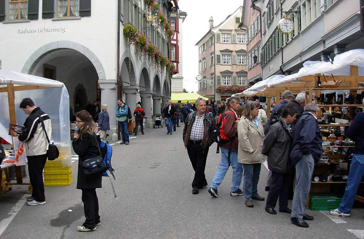 Emsiges Markttreiben im ganzen Städtchen Lichtensteig: Es wird das wahrscheinlich grösste Angebot an historisch interessanten Kameras und nützlichen Geräten und Zubehören an einem Flohmarkt in der Schweiz geboten