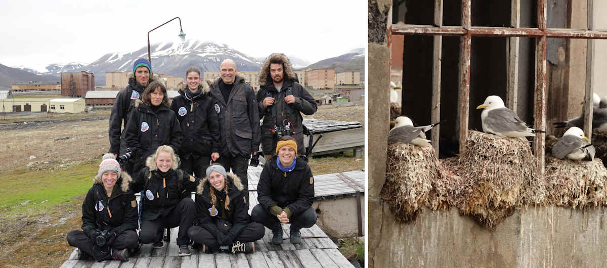 Unsere Gruppe bei der russischen Siedlung «Pyramiden». Sie war früher die nördlichste Kohlemine der Welt. Heute überwintern hier einige russische Einwohner, und Vögel bauen ihre Nester in den Fenstern der alten Gebäude.