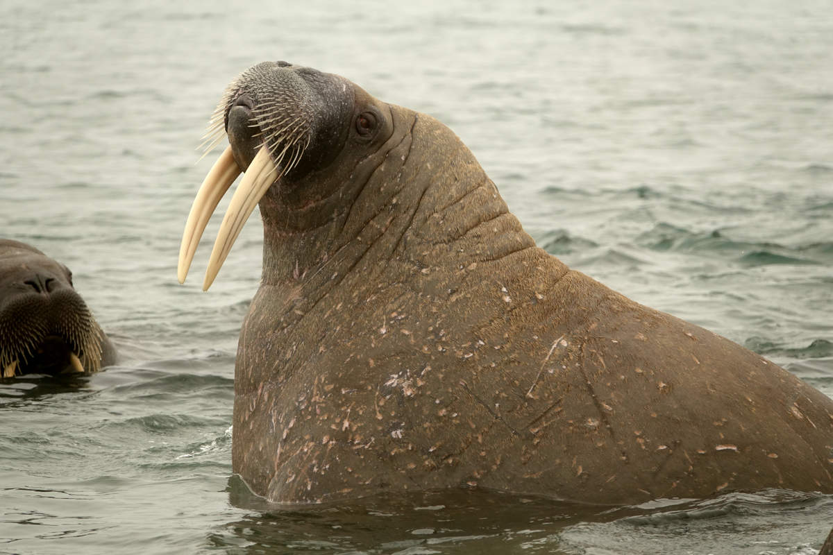 Unsere Reise führte uns weiter zu einer Walrosskolonie, die sich am Strand gemütlich von ihrer anstrengenden Futtersuche erholten. Einige Tiere waren besonders neugierig. Sie schlichen sich vom Wasser her an unsere Gruppe heran und begutachteten uns mit ihren grossen Augen.