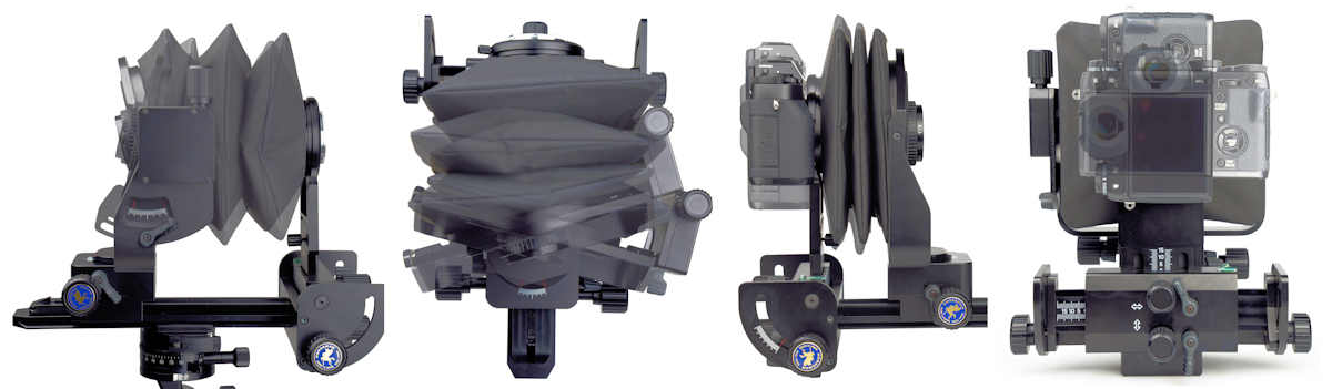 Die beiden Standarten lassen sich für Schärfeausgleich und Perspektivenkorrektur in allen Richtungen bewegen. Zudem kann die Kamera parallel verschoben von vom Quer- ins Hochformat gedreht werden.