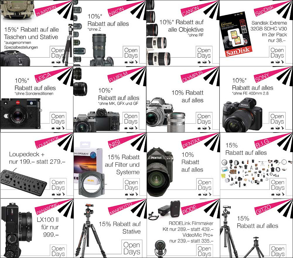 Der Zeitpunkt ist günstig: was auf der Photokina vor einem knappen Monat gezeigt wurde, ist jetzt handfest da. Dazu gehören als Highlights beispielsweise die neuen spiegellosen Kameras Canon EOS R und Nikon Z6/Z7 und die Fujifilm X-T3, dann aber auch neue Objektive von Sigma, Hasselblad und Zeiss sowie jede Menge Taschen, Stative, Leuchten für Video und Studio sowie diverses nützliches Zubehör. Das Angebot ist immens, und nicht zuletzt inspirieren die Open Days, wie man seine Fotoausrüstung noch weiter sinnvoll ausbauen kann.