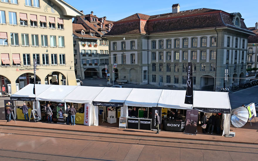 Dieses Jahr wird das grosse Show-Zelt nicht auf dem Casinoplatz stehen, sondern auf dem nahegelegenen Kornhausplatz. Grund: Eigentlich wäre vor dem Geschäft von Foto Video Zumstein eine grosse Baustelle, die zur renovierten Kirchenfeldbrücke gehört. Da hat die Geschäftsleitung kurzerhand beschlossen, sich im Kornhausforum für die Vorträge und auf dem Platz davor für das Zelt einzumieten. Was niemand wissen konnte: Die Bauarbeiten waren schneller beendet als geplant, so dass der Casinoplatz nun wieder gänzlich begehbar ist.