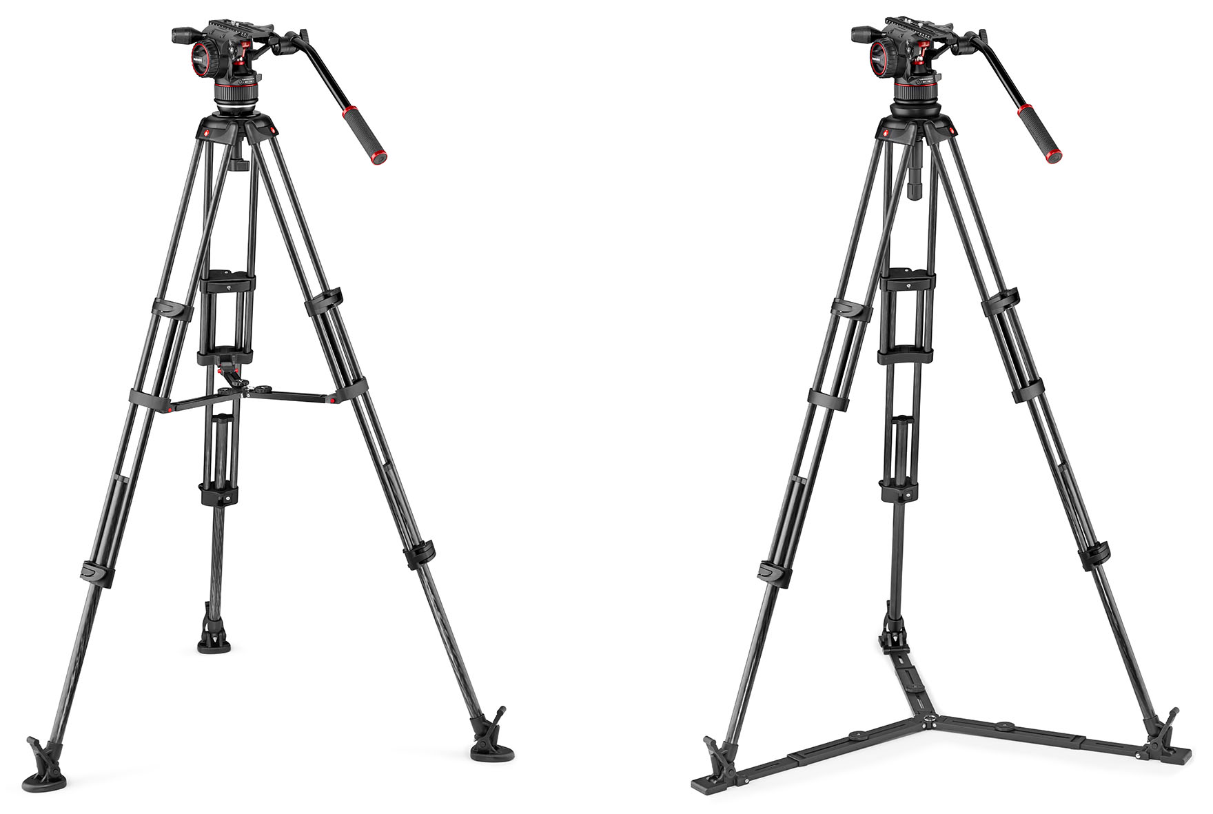 Leicht, ultrastabil, äusserst anpassungsfähig: Die beiden neuen Carbon-Videostativmodelle – links die Variante mit Mittelspinne und rechts mit Bodenspinne – sind besonders leicht und verdrehsteif. Abgebildet sind die Kits mit Nitrotech Fluid-Videoköpfen.