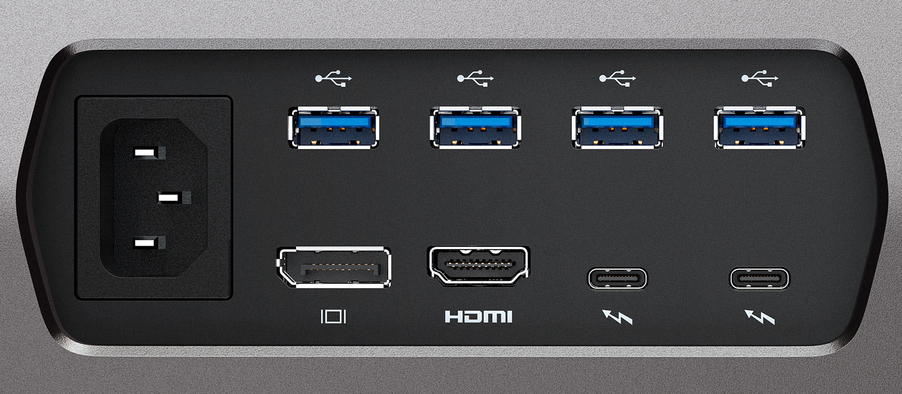 Thunderbolt: 2x Thunderbolt-3-USB-C-Ports mit 85W-Stromversorgung über Host-Geräte USB: 4x USB-Typ-A-Ports mit Datenraten-Support für USB 3.1 Gen 1 und Ladestrom bis zu 1,5 A auf jedem Anschluss HDMI: 1x HDMI-2.0-Port mit Support für Bildschirmauflösungen bis UHD und 4K DCI bei 60 fps |