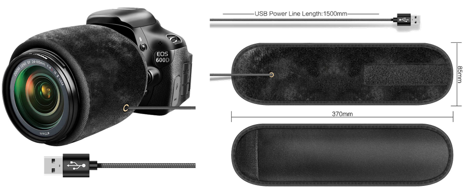 Die Heizmanschette wird an eine Powerbank angeschlossen, ist mit einem Klettband schnell am Objektiv montiert und bereits nach fünf Sekunden warm. Das Band besteht aus Neopren und Polyester, hat eine Länge von 37 cm und eine Breite von 8,5 cm. Die beiden Klettbandstreifen, mit denen die Heizmanschette befestigt wird, haben eine Länge von 12 cm. Die eingebauten Kohlefaser-Heizelemente sind ca 18 cm lang, das USB-Kabel ist ca 1,5 Meter. Der Stromverbrauch liegt mit 5V und 0.8A bei 4Watt.