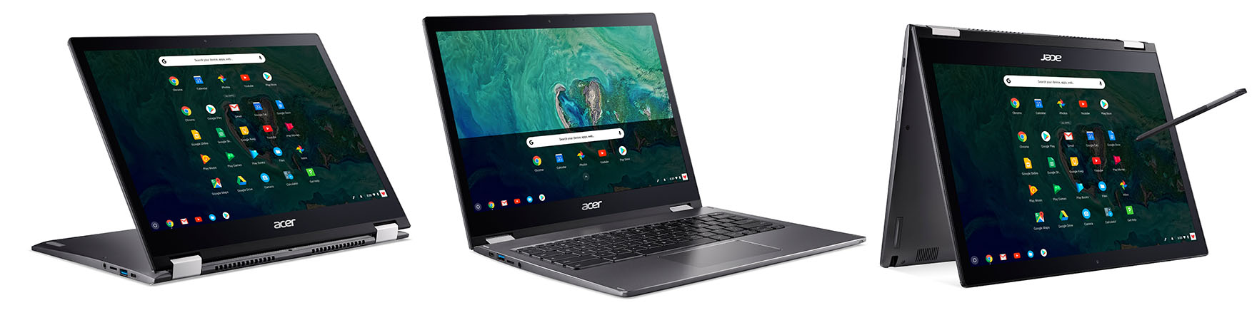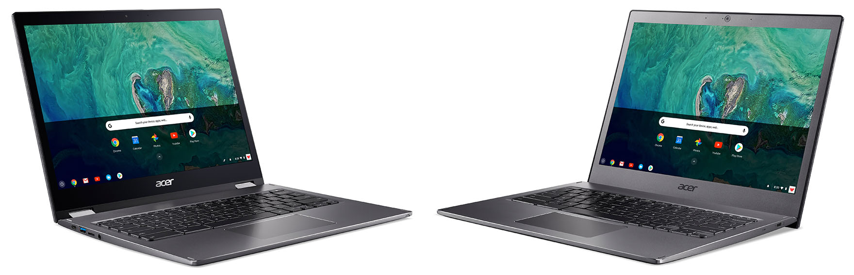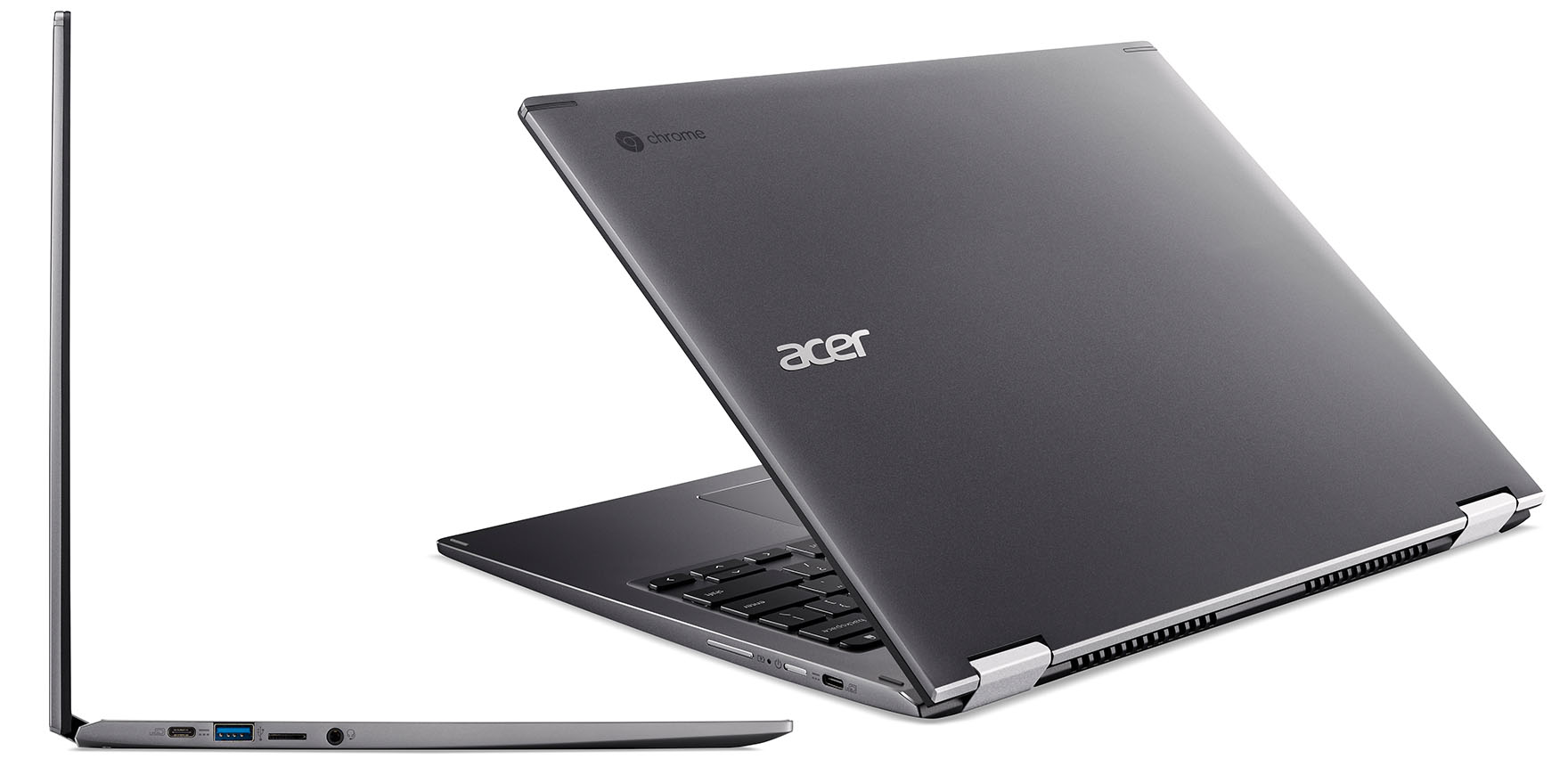 Die beiden äusserlich weitgehend Premium-Chromebooks (abgebildet ist das Spin mit 360-Grad-Scharnier) verfügen über zwei USB 3.1 Type-C-Ports für unkompliziertes Laden und schnellen Datentransfer. Sie kommen mit Chrome OS und Android-Apps-Unterstützung über Google Play.