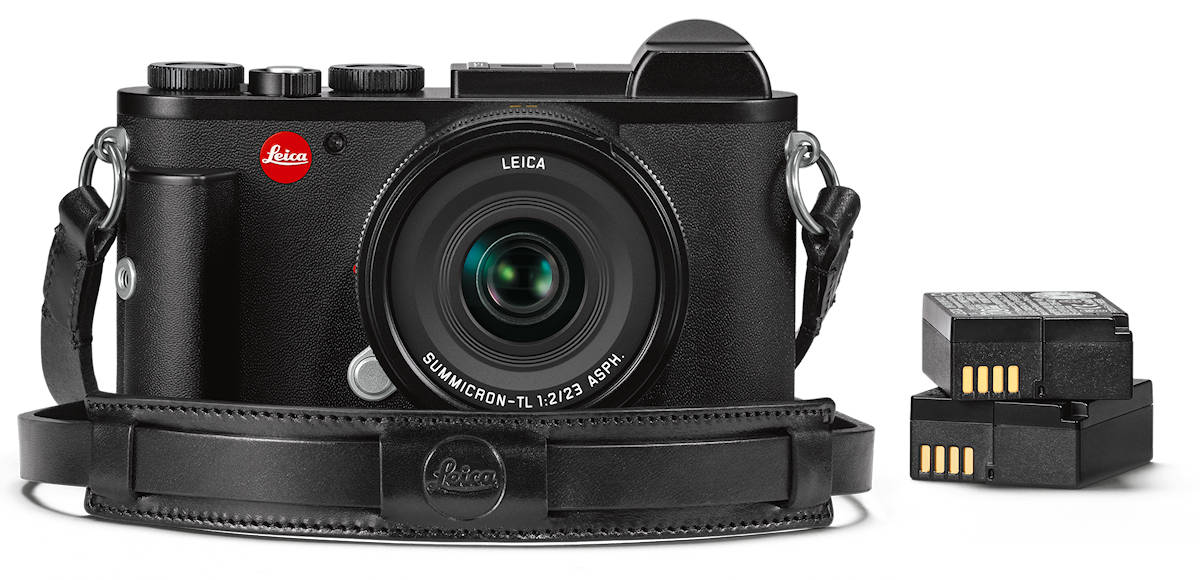 Der Leica Street-Kit: Die Leica CL mit Summicron-TL 1:2/23 ASPH in unauffälligem Schwarz, dazu Handgriff, Lederriemen und zwei Akkus