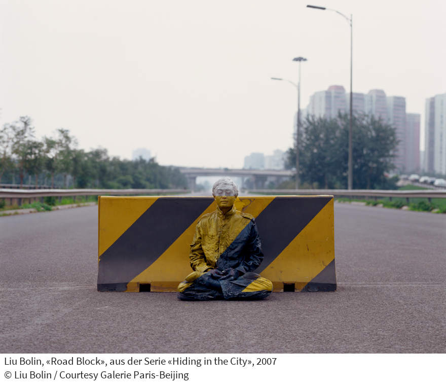 Im Jahr 2005 beginnt der Künstler seine Serie «Hiding in the City» mit einem Autoporträt, auf dem er komplett bemalt, regungslos und kaum auszumachen vor den Ruinen seines eigenen Ateliers steht, das in dem von der chinesischen Regierung abgerissenen Künstlerviertel lag. Von da an wird für ihn jeder nur denkbare Ort zum potentiellen Ort des Schaffens, in dem er jedoch nur auf paradoxe Weise in Erscheinung tritt: er ist unsichtbar und dabei doch unglaublich präsent.