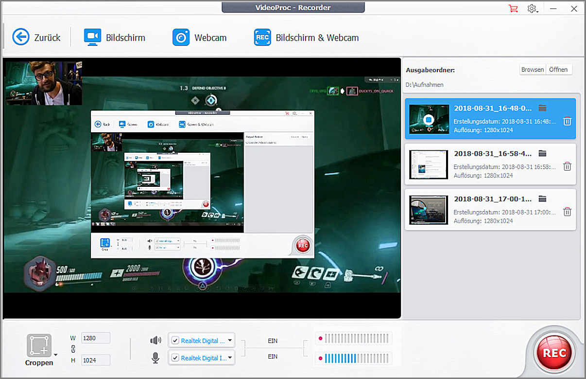 Recorder. Einfache, aber leistungsstarke Screen Recorder Software, für Gamer, Sportbegeisterte, Pädagogen und Live-Enthusiasten ist VideoProc das bevorzugte Tool, um Gameplay, Präsentationen, Webinare, Skype-Anruf, Streaming-Video aufzunehmen und Vlogs, Screencasts, Podcasts, Videos zum Softwaretest und Video-Anleitungen zu erstellen. So können Sie einfach interaktiv mit Ihrem Publikum und Ihren Teamkollegen kommunizieren.