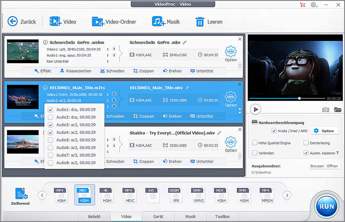 Das einzige vollständige GPU beschleunigte Videoverarbeitungsprogramm. VideoProc ist das schnellste Videoverarbeitungstool, das die durch Intel, AMD & NVIDIA GPUs angetriebene Level-3 Hardware-Beschleunigung unterstützt, und reibungslose (4K) Videobearbeitung & -transcodierung bietet, ohne die Qualität zu beeinträchtigen.