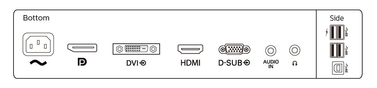 Der Monitor bietet auf der Rückseite neben dem Stromanschluss alle gängigen Bildschirmanschlüsse sowie einen Audioeingang und einen Köpfhörerausgang. Auf der linken Seite ist zudem ein USB-Hub mit klassischen Buchsen und Unterstützung für USB 3.0 integriert.