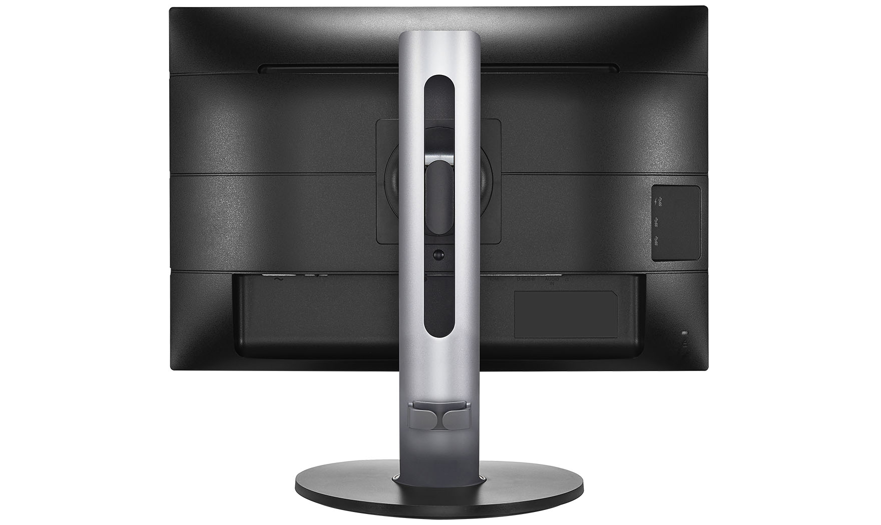 Rückseite des Philips 241B7QGJEB mit blick auf die silberne ErgoBase mit runder, schwarzer Bodenplatte. Zu sehen sind die Vertiefungen für die Signalanschlüsse und den seitlichen USB-Hub.