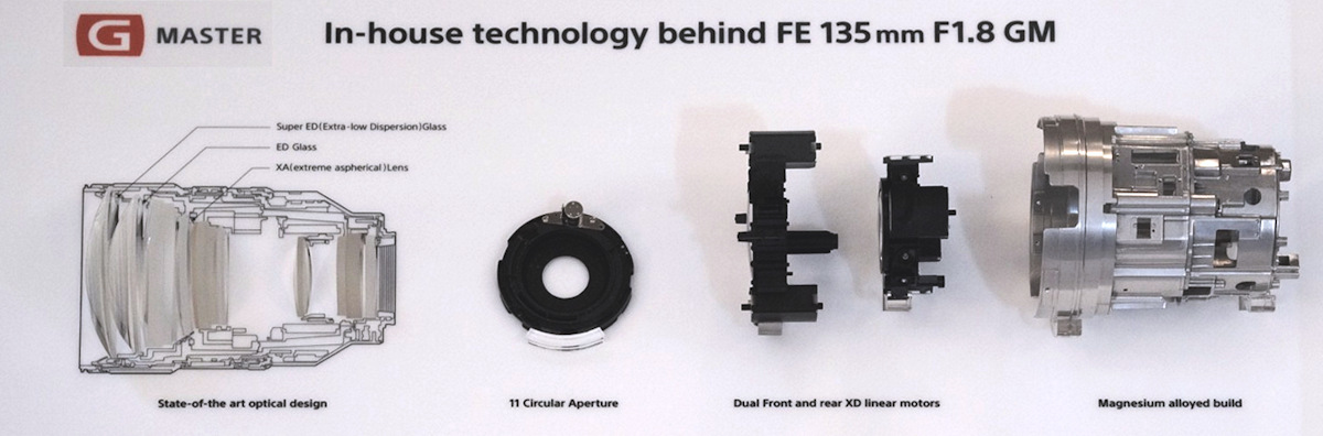 Das FE 1,8/135 mm GM besteht aus 13 Linsen in 11 Gruppen. Die 11 Blendenlamellen bewirken ein harmonisches Bokeh. Zwei lineare XD-Motoren sorgen für schnelles Fokussieren. Die innere Gehäuseeinheit besteht aus einer Magnesium-/Aluminium-Legierung.