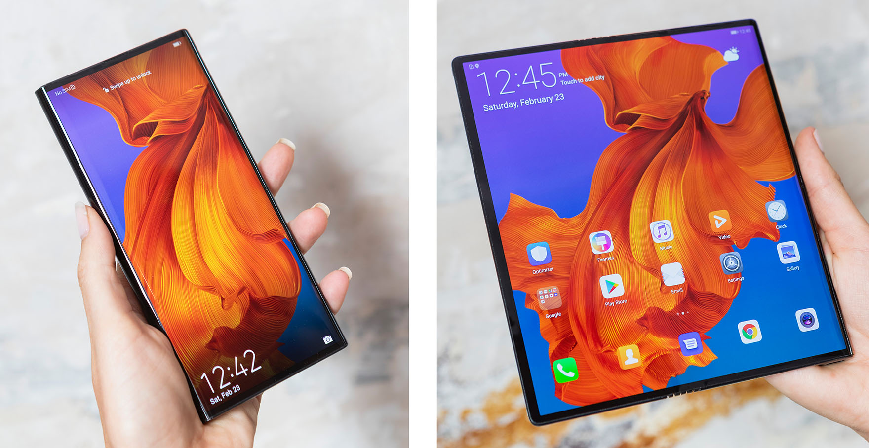 Das Huawei Mate X kann dank faltbaren OLED-Display als handliches Smartphone oder als kleines Tablet benutzt werden. Es ist 5,4 mm (an einem Seitenrand aber 11 mm) und zusammen geklappt ca. 11 mm dünn, während das Gewicht samt Akku bei 295 Gramm liegt.