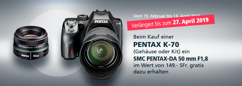 Die Pentax K-70 ist die Spiegelreflexkamera für mehr Spass am Bild. Die Bilder werden über den 24,24 Megapixel APS-C CMOS-Sensor mit Bildstabilisierung und ohne Tiefpassfilter aufgenommen und dank dem neuen Prime MII Prozessor schnell verarbeitet, übertragen und mit einer Rauschminimierung optimiert. Der 3’’ LCD-Monitor ist schwenkbar und zeigt mit einer Auflösung von 921’000 Bildpunkten ein klares und helles Bild. Aufnahmen bei schlechten Lichtbedingungen bewältigt die K-70 mit Empfindlichkeiten bis zu ISO 102’400, und für perfekt scharfe Videoaufnahmen steht ein Hybrid Autofokussystem zur Verfügung. Die kameraintegrierte Bildstabilisierung bewirkt eine Belichtungssicherheit bis 4,5 Lichtwerte und eine Pixel Shift Resolution mit Bewegungskorrektur. Sie ist wetter- und staubfest und erträgt Temperaturen bis -10° Arbeitsumgebung. Zur Pentax KP gibt es jetzt in der Frühjahrpromotion ein SMC Pentax-DA 50mm F1,8 im WErt von CHF 149.– gratis dazu.