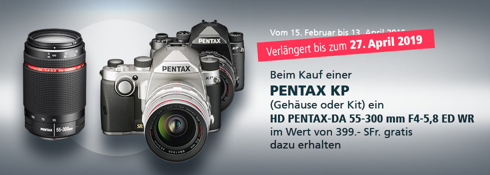 Die Pentax KP ist als Spiegelreflexkamera mit ihrem CMOS-APS-C Sensor mit 24 Megapixel und einem riesigen Empfindlichkeitsbereich von ISO 100 bis ISO 819’200 für perfekte Bildergebnisse auch bei wenig Licht konzipiert. Dabei verhindert die 5-achsige Bildstabilisierung verwackelte Bilder. Der klappbare 3” Monitor ermöglicht verschiedene Darstellungsoptionen und damit interessante Perspektiven – auch bei schnellen Objekten, die mit den elektronischen Verschluss mit bis zu 1/24’000 Sekunde eingefroren werden. Die Kamera ist mit 67 Dichtungen staub- und wetterfest und bis -10° kälteresistent. Mit den Wi-Fi-Funktion ist die kabellose Aufnahmesteuerung ebenso möglich wie die sofortige Bildübertragung. Zur Pentax KP gibt es jetzt in der Frühjahrpromotion das HD Pentax-DA 55-300mm F4.5-5,8 ED WR im Wert von CHF 399.– gratis dazu.