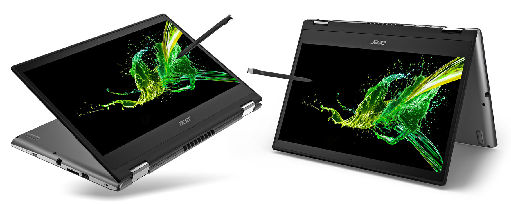 Acer Spin 3 (2019) in zwei Nutzungsmodi: Als flaches oder leicht aufgeklapptes Tablet lässt sich ein Convertible gut zur Bildretusche mittels Stift verwendet. Für die Präsenatation von Bildern kann es in Zelt-Stellung hingestellt werden.  Mit einem 9,6 mm dünnen Displayrand und 35,6 cm (14 Zoll) Full HD-IPS-Touchscreenund dank seines langlebigen 360-Grad-Scharniers flexibel und wandelbar.