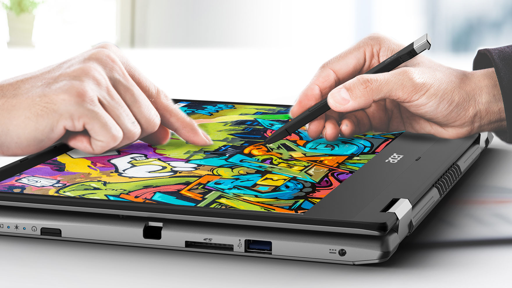 Bei einem geringen Gewicht von 1,7 kg lässt sich das neue Spin 3 leicht in einer Handtasche oder Aktentasche verstauen. Der nur 9,6 mm schmale Displayrahmen vergrössert die sichtbare Bildschirmfläche und sorgt dank einer 79 Prozent Screen-to-Body-Ratio für ein stylishes Design. Gleichzeitig ermöglicht das 360-Grad-Scharnier den nahtlosen Wechsel zwischen Laptop- oder Tabletmodus und macht das Spin 3 zur idealen Werkzeug für Bildbearbeitung, Korrespondenz, Bildpräsentation oder was sonst noch so anfällt. Nutzer können das 35,6 cm (14 Zoll) grosse Full HD-IPS-Touchdisplay des Spin 3 zeitgleich per Touch- und per Stylus bedienen, wobei der Acer Active Pen die präzise und direkte Eingabe auf dem Bildschirm ermöglicht, um komplexe Aufgaben effizient zu bearbeiten. Mit dem versenkbaren Active Pen können Nutzer ihre Notizen sofort übernehmen und haben ihn jederzeit schnell zur Hand.