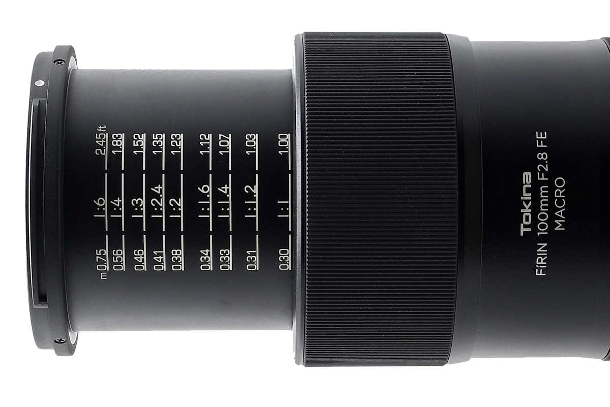 Die Makroskala des Tokina Fírin 2,8/100mm FE Macro zeigt Entfernung und Abbildungsmassstab an