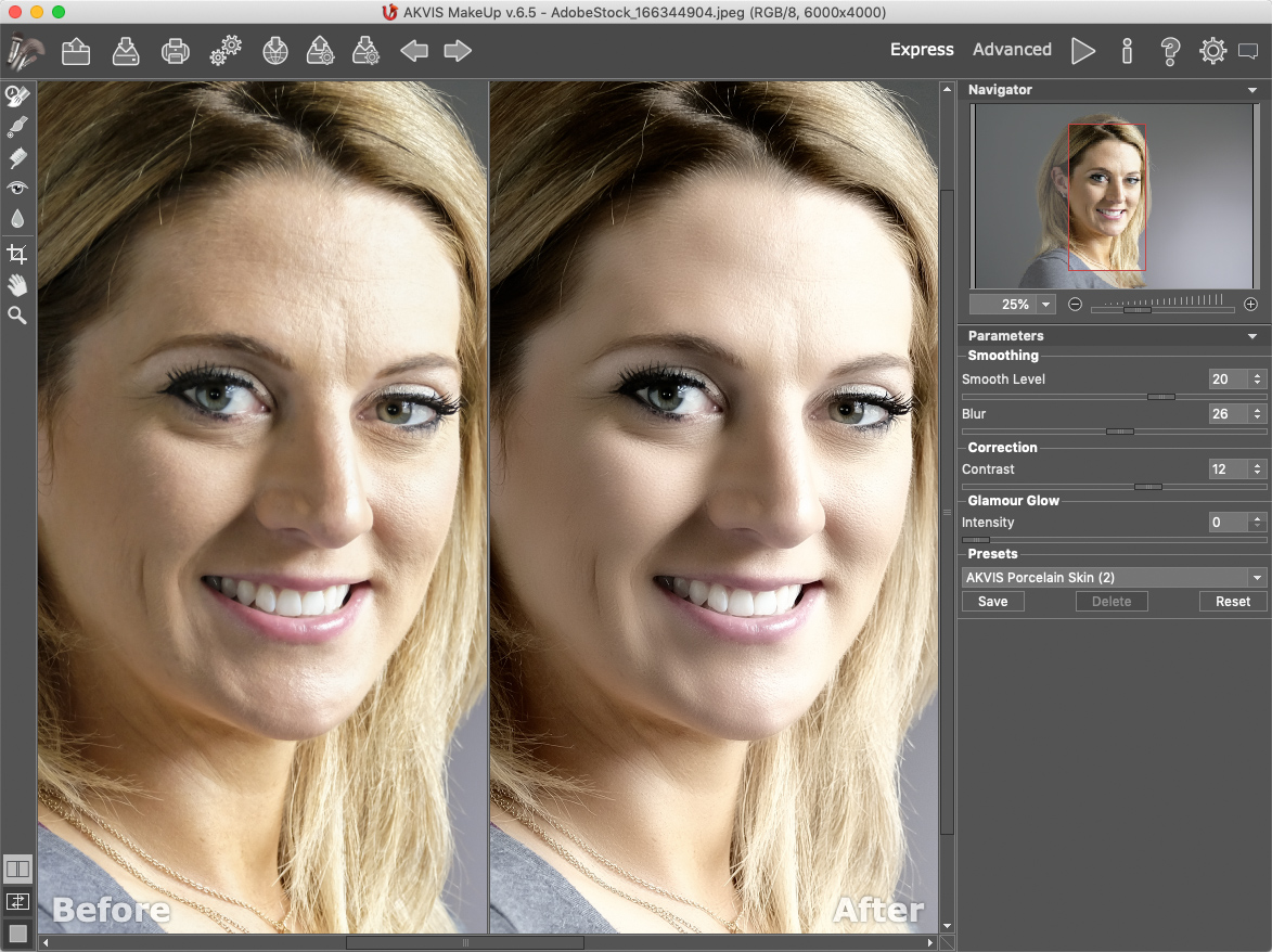 Akvis MakeUp erlaubt es, Porträts professionell zu retuschieren und bietet viele automatische Funktionen. Die Software entfernt automatisch Falten, Hautunreinheiten und andere Defekte und verleiht der Haut ein makelloses, aber dennoch natürliches Aussehen. Das Programm mildert die Schatten und lässt das Gesicht jünger erscheinen. Akvis MakeUp funktioniert in zwei Modi: Express (besonders für Einsteiger geeignet) und Erweitert (für komplexere Bildmanipulationen). Ein weiterer Pluspunkt ist die Stapelverarbeitungsfunktion, die es erlaubt, in einem einzigen Durchgang Modifikationen an mehreren Bildern vorzunehmen.