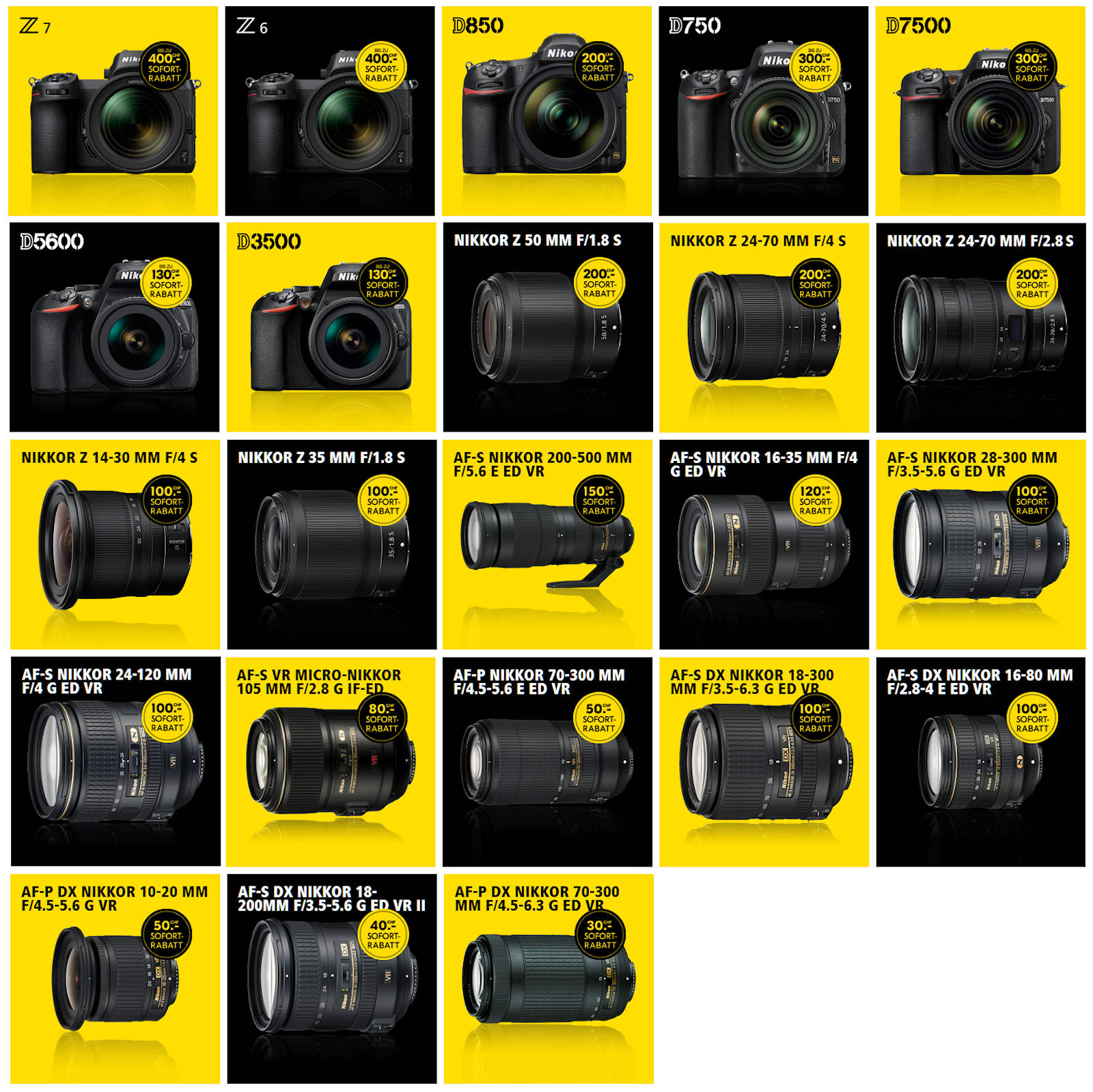 Der Kauf von bis zu bis zu zwei Kameras und drei Objektive (nur Neuware) je Kunde, begrenzt auf den erwähnten Aktionszeitraum, berechtigt zur direkten Verrechnung des Rabattes. Der Rabatt wird ausschliesslich von teilnehmenden Händlern und direkt beim Kauf eines aktionsberechtigten Produktes verrechnet. Berechtigt sind nur die aufgeführten Produkte und nur solche, die offiziell von der Nikon GmbH, Düsseldorf, Zweigniederlassung Schweiz (Egg/ZH) importiert wurden. Von der Nikon GmbH, Düsseldorf, Zweigniederlassung Schweiz (Egg/ZH) ausgelieferte Produkte erkennt man am Nikon Swiss Garantie Kleber auf der Aussenseite der Verpackung.