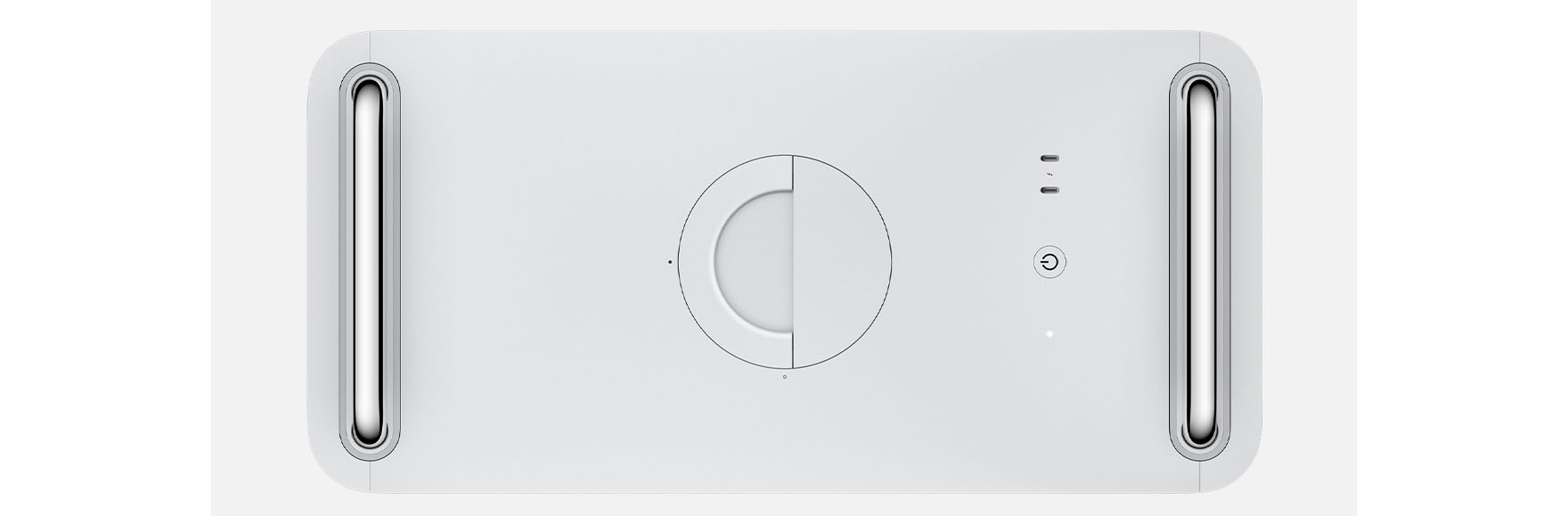 Blick von oben auf das Gehäuse des Mac Pro und seine Griffe: Mit den beiden praktischen Griffen können Nutzer den Mac Pro problemlos im Studio hin und her bewegen. Mit dem Griffverschluss in der Mitte wird das Gehäuse geöffnet bzw. die Verschalung hoch gezogen.