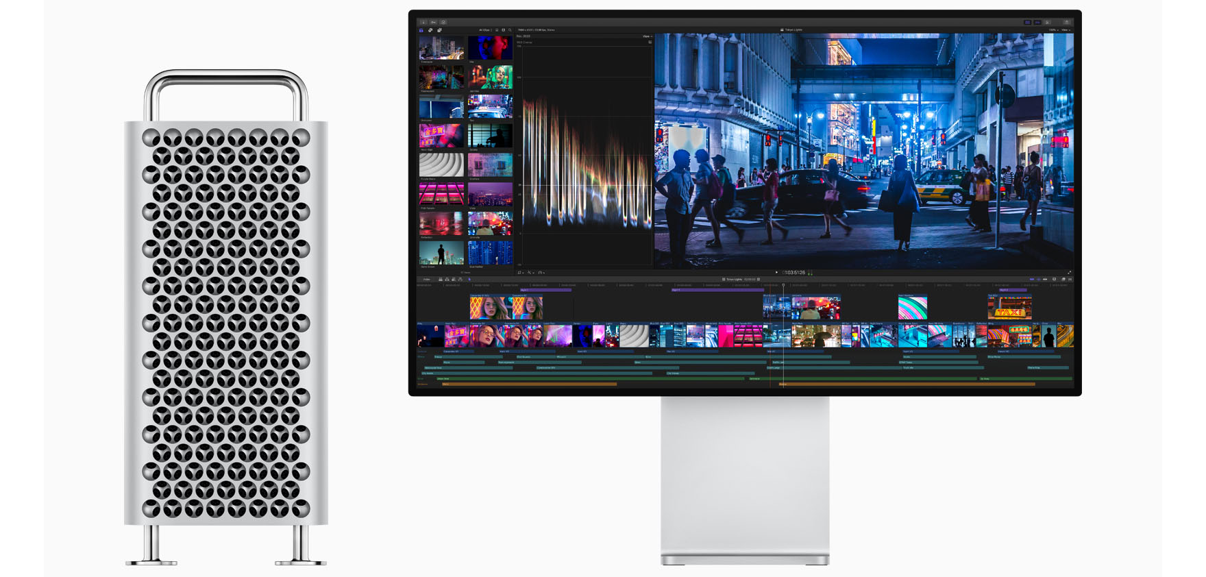 Der neue Mac Pro neben dem neuen Display Pro XDR (hier mit Final Cut Screen): Der neue, komplett überarbeitete Desktop-Rechner bietet maximale Leistung, Erweiterung und Konfigurierbarkeit. Mit Afterburner auf dem neuen Mac Pro können Videoeditoren bis zu drei Streams von 8K ProRes RAW-Video und 12 Streams von 4K ProRes RAW-Video in Echtzeit dekodieren.