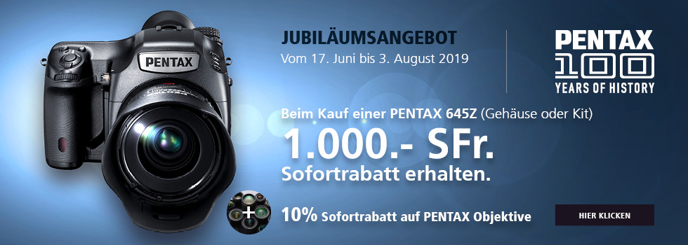 Pentax feiert dieses Jahr ihr 100jähriges Jubiläum. Aus diesem Anlass gibt es auf verschiedene Pentax-Kameras interessante Sofortrabatte. Die Jubiläumsaktion läuft noch bis 3. August 2019. Die Aktionen betreffen die Mittelformatmodell 645Z, die Pentax K-1 II sowie die dazugehörenden Objektive.