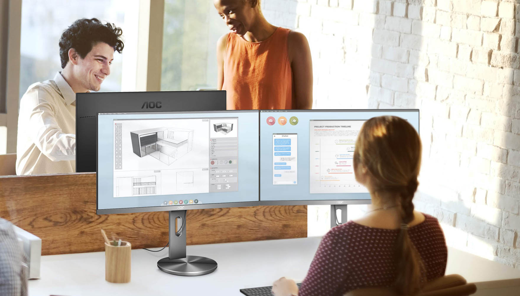 Zwei U2790PQU nebeneinander. Das neue ergonomische und hochwertige Display von AOC soll sich an Profis und Prosumer richten sich. Das elegante, nahezu rahmenlose Design erlaubt – wie im Bild – Multi-Monitor-Setups.