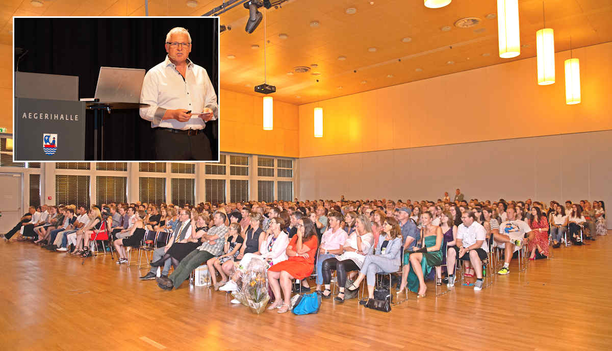 Die «Aegerihalle» war bis auf den letzten Platz gefüllt. Gespannt warteten die Absolvent/-innen bis Alex Mächler die Diplomfeier eröffnete