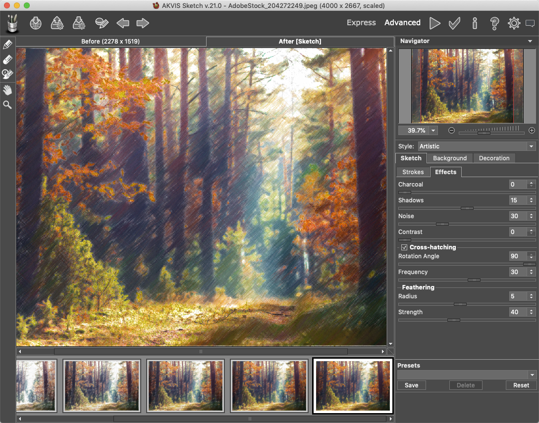 Akvis Sketch ist eine bewährte Software zur Umwandlung von digitalen Bildern in realistische Bleistiftskizzen. Es gibt zwei Umwandlungsstile: Klassischer und Künstlerischer. Jeder Modus ist mit Dutzenden von Presets ausgestattet, die laut Akvis von professionellen Künstlern erstellt wurden. Je nach individuellem Bedarf kann man zwischen zwei Arbeitsmodi wählen: Express und Erweitert. Darüber hinaus bietet das Programm vielseitige Gestaltungsoptionen: Hinzufügen einer Leinwandtextur, eines Textes, eines Wasserzeichens, eines Bilderrahmens usw.
