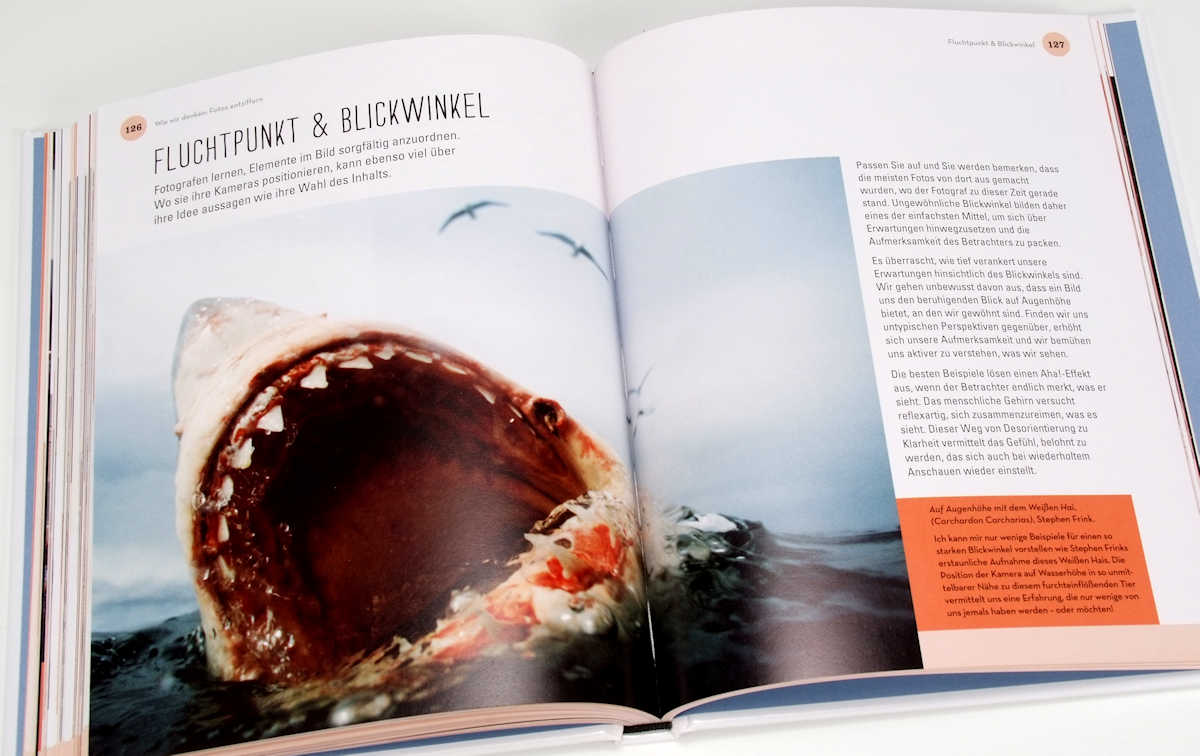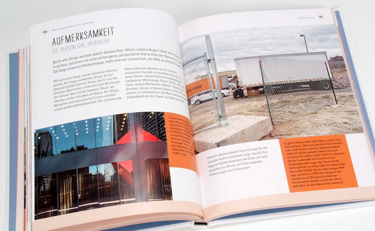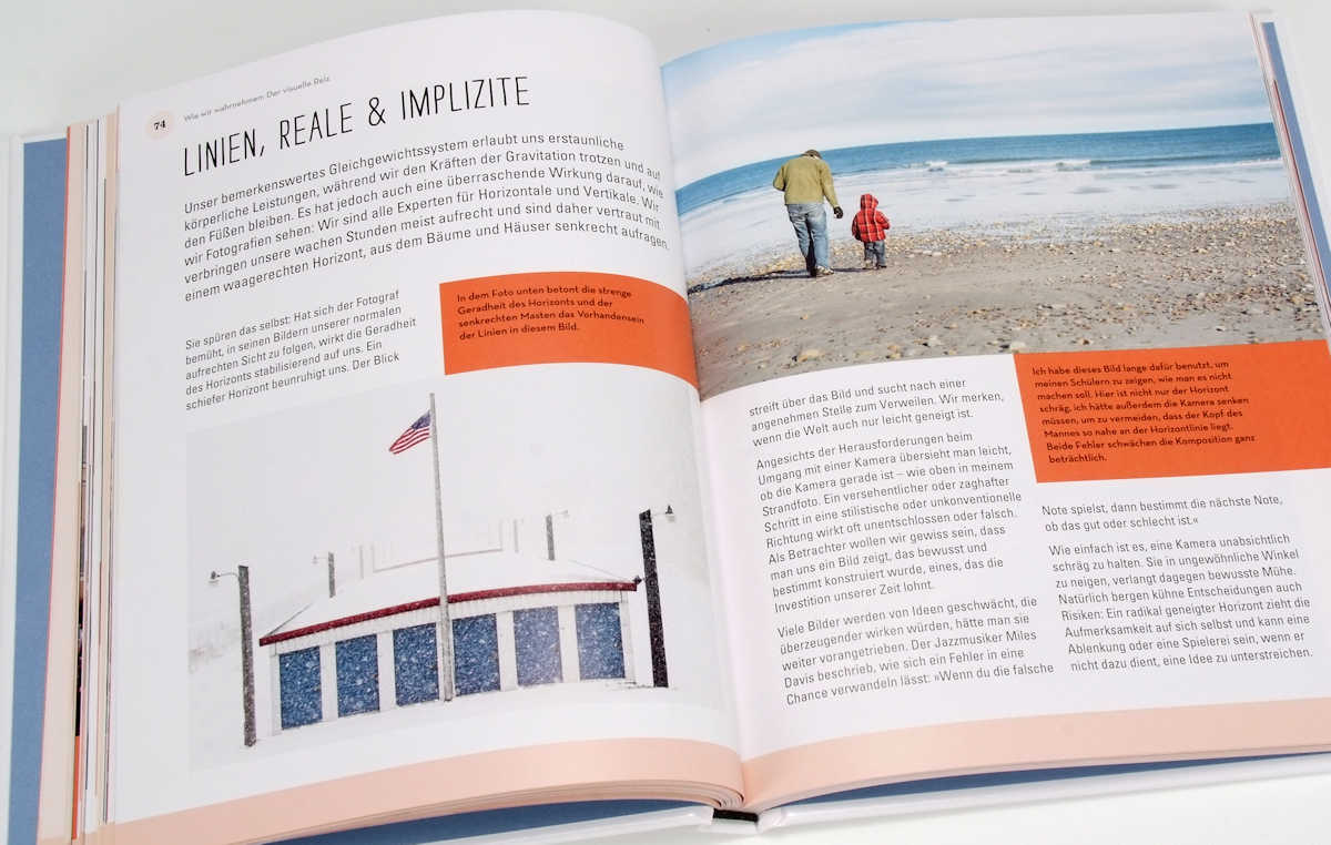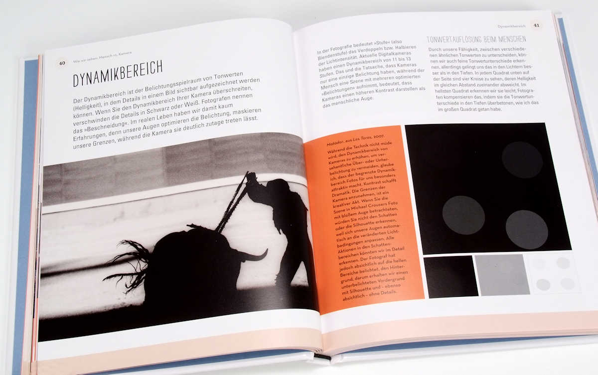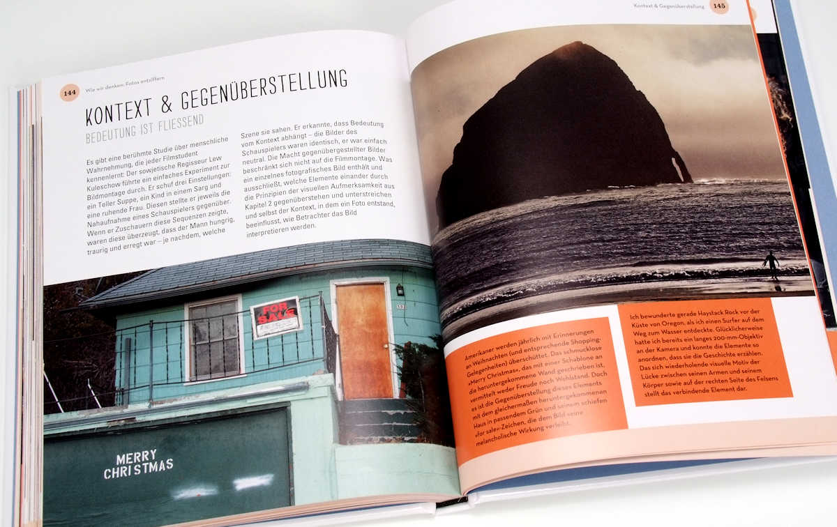 Wenn der Band „Bilder wirken“ hiesse – dann würde ich dir zustimmen und sagen: Du hast recht. Dann müssten die Bilder ihre Wirkung umfassend entfalten können. Wir haben aber keinen Bildband vor uns, sondern ein Werk mit vermittelndem Charakter. Als Fotodidaktiker – was ist denn das nun wieder? – finde ich das Buch grafisch gut, ja sogar sehr gut gemacht: Die Erläuterungen korrespondieren mit den Bildern. Die einzelnen Stufen der vermittelnden Textelemente (Klar abgesetzter Titel, kurze einspaltige Einleitung, zweispaltige Vertiefung, Farbbox mit Bildkommentar direkt am Bild angedockt, …) sind sofort erkennbar und dienen der Orientierung der Leser/-innen.