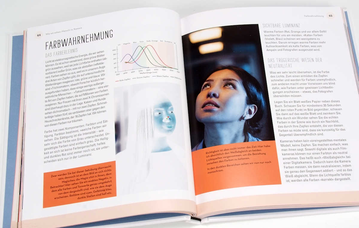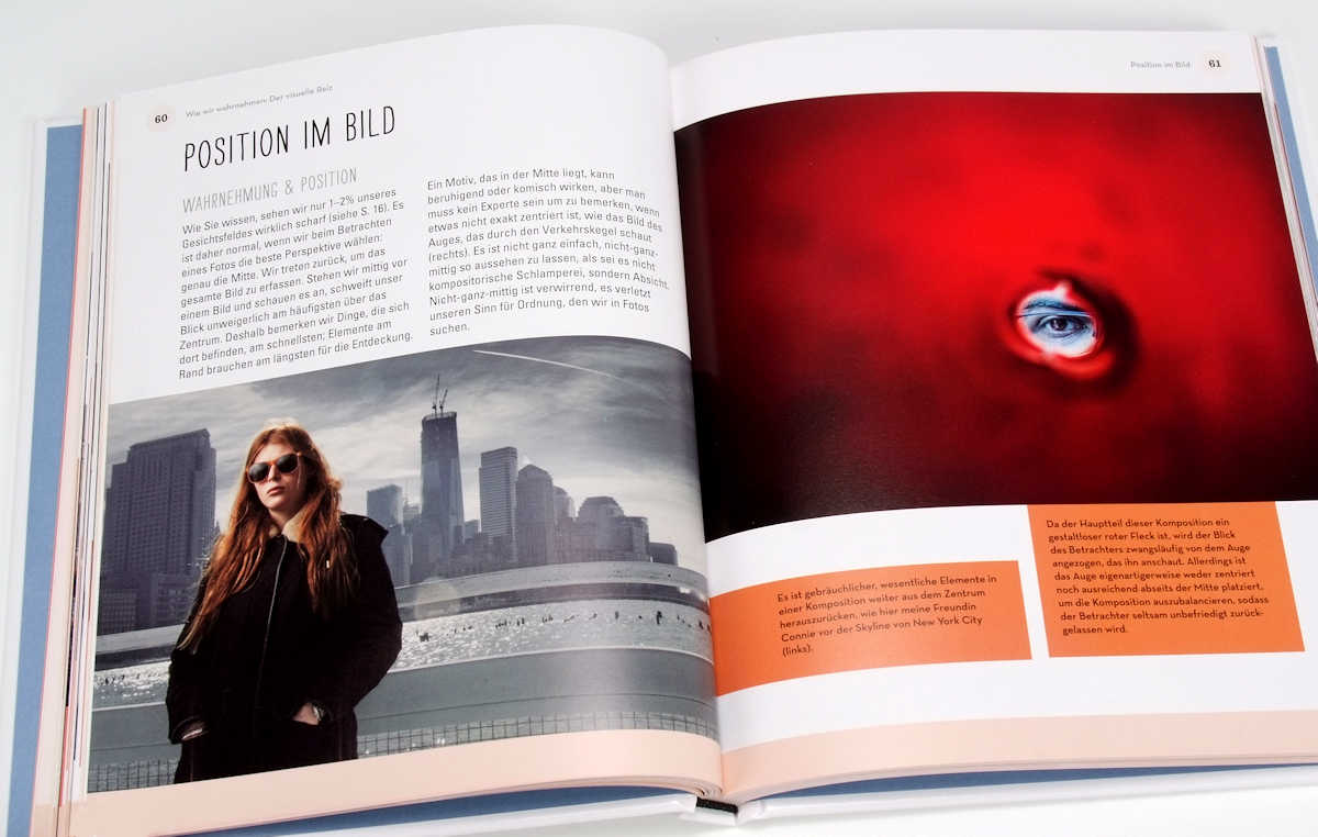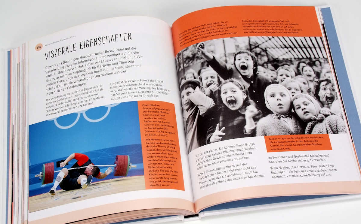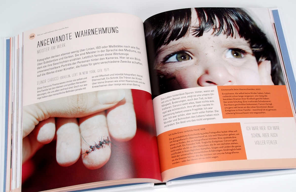 Wenn der Band „Bilder wirken“ hiesse – dann würde ich dir zustimmen und sagen: Du hast recht. Dann müssten die Bilder ihre Wirkung umfassend entfalten können. Wir haben aber keinen Bildband vor uns, sondern ein Werk mit vermittelndem Charakter. Als Fotodidaktiker – was ist denn das nun wieder? – finde ich das Buch grafisch gut, ja sogar sehr gut gemacht: Die Erläuterungen korrespondieren mit den Bildern. Die einzelnen Stufen der vermittelnden Textelemente (Klar abgesetzter Titel, kurze einspaltige Einleitung, zweispaltige Vertiefung, Farbbox mit Bildkommentar direkt am Bild angedockt, …) sind sofort erkennbar und dienen der Orientierung der Leser/-innen.