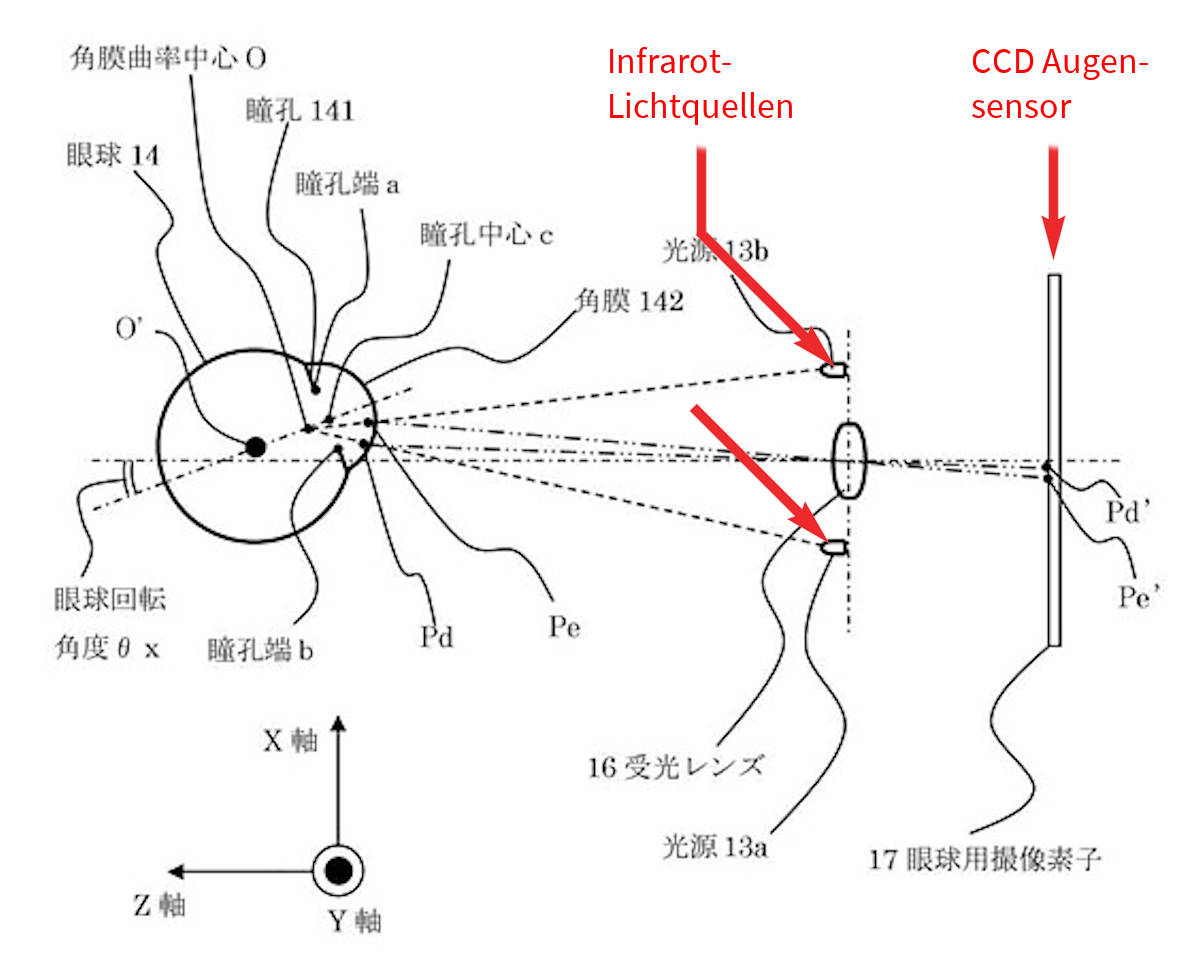 Im Prinzip soll die neue augengesteuerte Scharfeinstellung nicht viel anders funktionieren als das frühere «eye controlled autofocus» der analogen Kameramodelle: Die Ermittlung der Blickrichtung und -entfernung erfolgt mittels zweier Infrarotleuchten, welche auf das Auge gerichtet sind, und eines CCD-Sensors, der die Blickrichtung der Pupille wahrnimmt sowie die Entfernung zum Objekt im Sucherbild abgleicht. Allerdings dürfte dieses Prinzip mit moderner Elektronik und CCD- anstatt CMOS-Technologie sehr viel zuverlässiger funktionieren als dies vor knapp dreissig Jahren der Fall war. Ob wir dieses Feature bald in einer neuen Canon-Kamera finden ist fraglich. Aber immerhin zeigt das Patent, dass sich die Canon Forschung und Entwicklung mit dieser Thematik befasst.