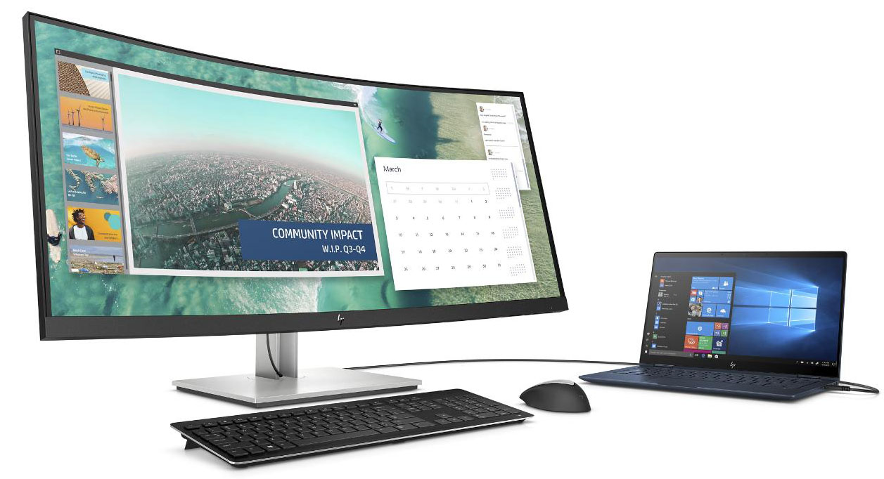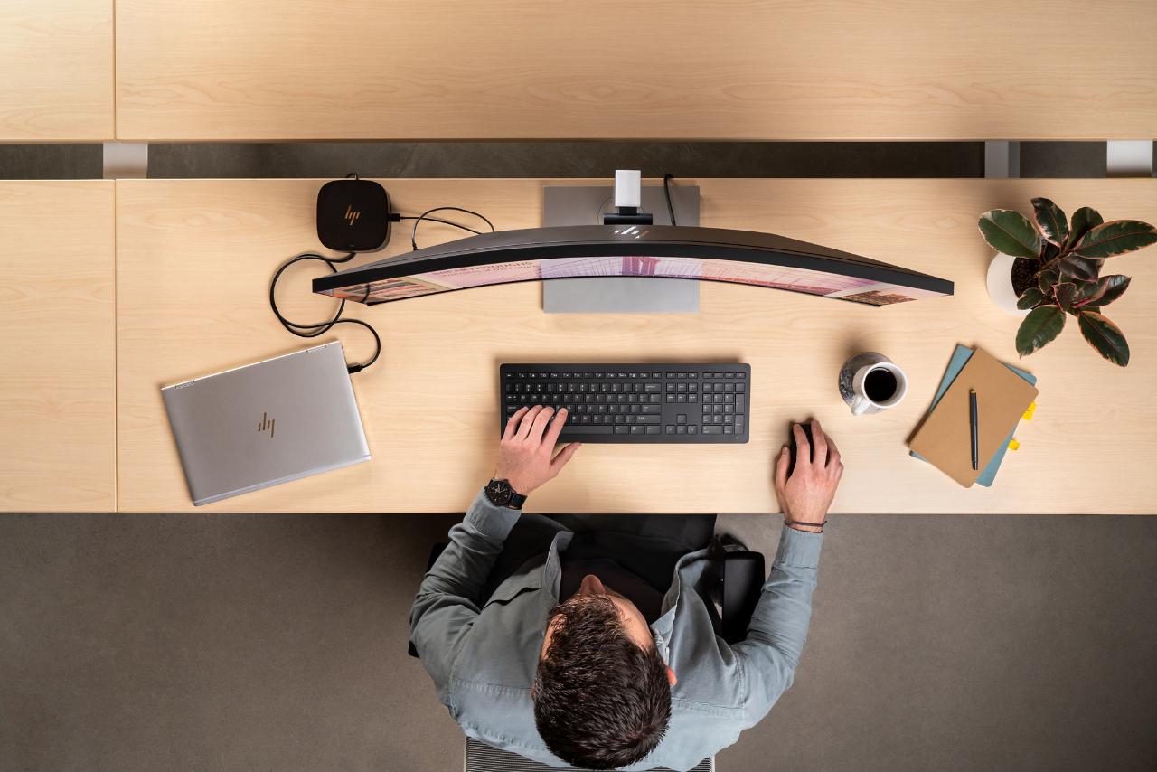 Ultrawide Curved Displays sorgen für mehr Produktivität: Im Bild ist der HP S430c samt dem angeschlossen HP Elite Dragonfly – einem leichten 13-Zoll-Notebook-Tablet – zu sehen.