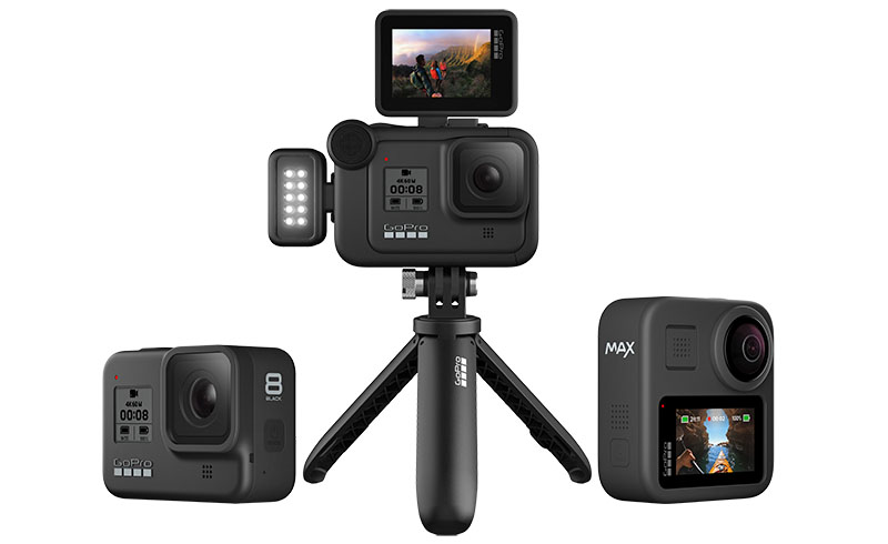 GoPro hat die Mutter aller Actioncams in einer neuen Version als Hero8 präsentiert, die nun einen modularen Ansatz mittels Zubehörteilen – Mods genannt – verfolgt. Die Hero8 Black nimmt Videos in 4K@60p und 12 Mpx auf und beherrscht Live-Videostreaming in 1080p. Sie ist robust und bis 10m wasserdicht. Zudem wurde mit der GoPro Max eine 360-Grad-Kamera aus zwei Rücken an Rücken verbauten 180-Grad-Kameramodulen vorgestellt. Beide Kameras in Kürze in den Handel.