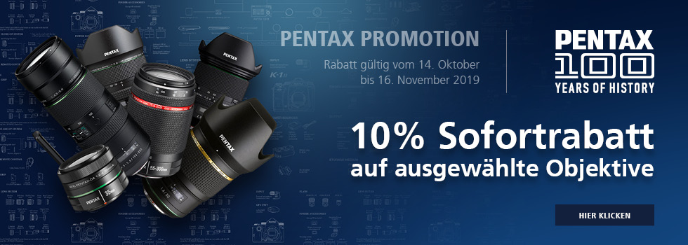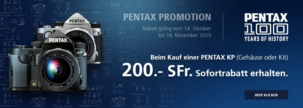 Die Rabattaktion von Ricoh-Pentax ist beschränkt von heute, 14. Oktober bis 16. November 2019. Dabei gibt es beim Kauf einer Pentax KP Spiegelreflexkamera eine Sofort-Cashback-Vergünstigung von CHF 200.— und einen Rabatt von 10% auf 11 selektierte Objektive.