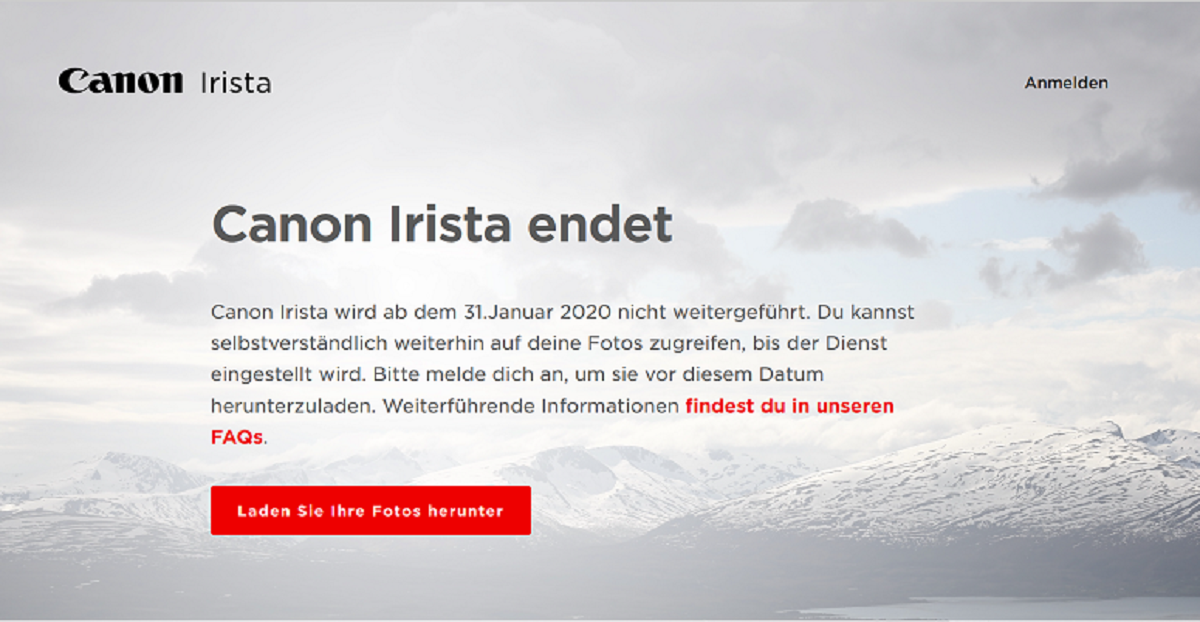 Wer die Irista-Seite von Canon aufruft findet dort den Hinweis, dass Canon die Foto- und Video-Cloud Irista zum 31. Januar 2020 beendet. Dann werden alle Daten gelöscht. Wer seine Bilder sichern will, kann sie bis zu diesem Termin noch herunterladen. Da der Download nach Aussage von Canon einige Zeit in Anspruch nehmen könne, wird empfohlen, möglichst früh mit dem Herunterladen der Dateien beginnen. Irista wird nicht nur gelöscht, sondern wird auch keinen Nachfolger im Hause Canon erhalten. Seit am 29. Oktober 2019 der Service aufgekündigt wurde, entfallen die zuvor fälligen Abogebühren, allerdings kann das Speichervolumen auch nicht mehr erweitert werden. Fotobücher können aus Irista noch bis zum 14. Januar 2020 in Auftrag gegeben werden. Danach entfällt auch diese Option.