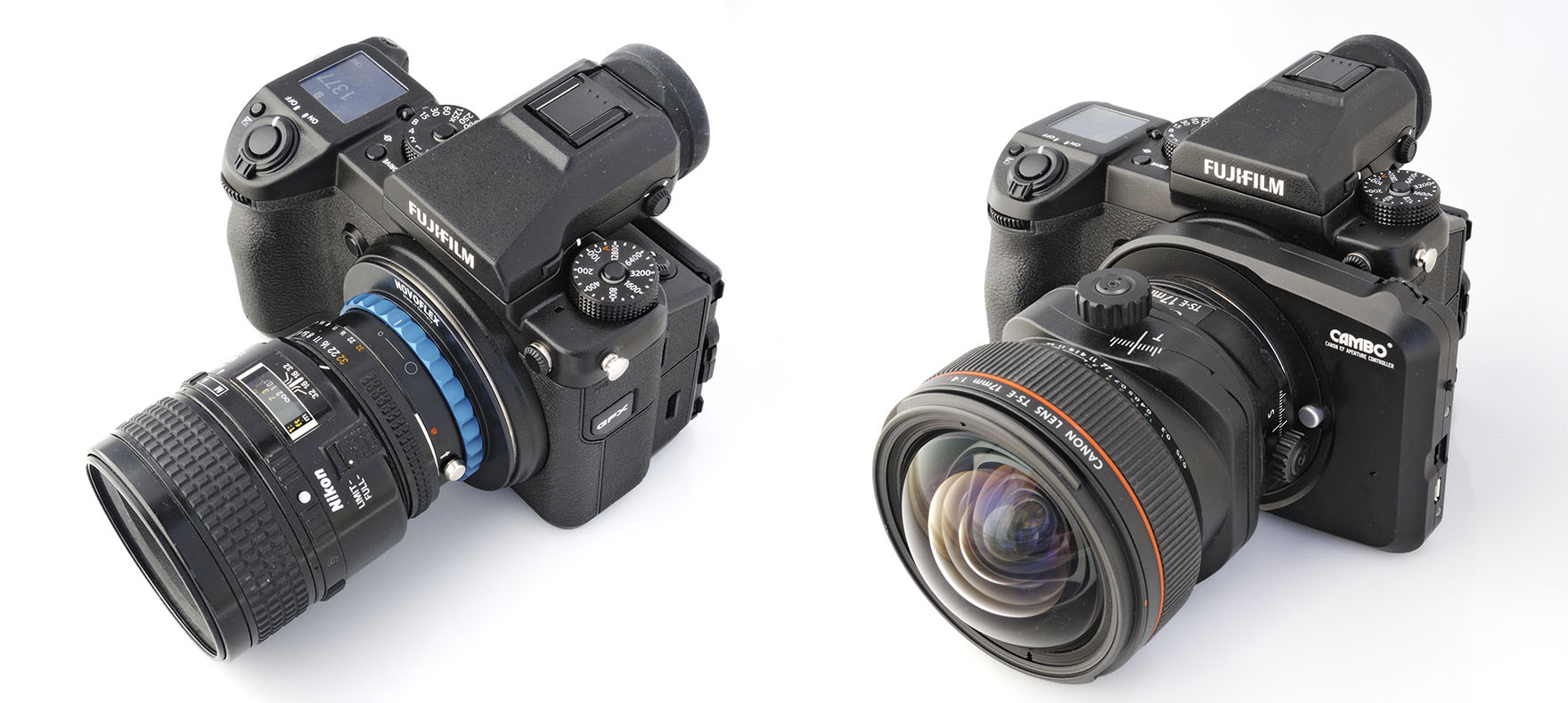 Kleinbild-Objektivadapter an einer GFX 50S: Den Novoflex FUG/NIK (links) für Nikon-Objektive gibt es im Fachhandel (Distributor: Perrot Image). Der Cambo CA-GFX (rechts) ist im Fachhandel und bei GraphicArt erhältlich. Er ermöglicht die Verwendung von Objektiven mit «Canon EF»-Anschluss.