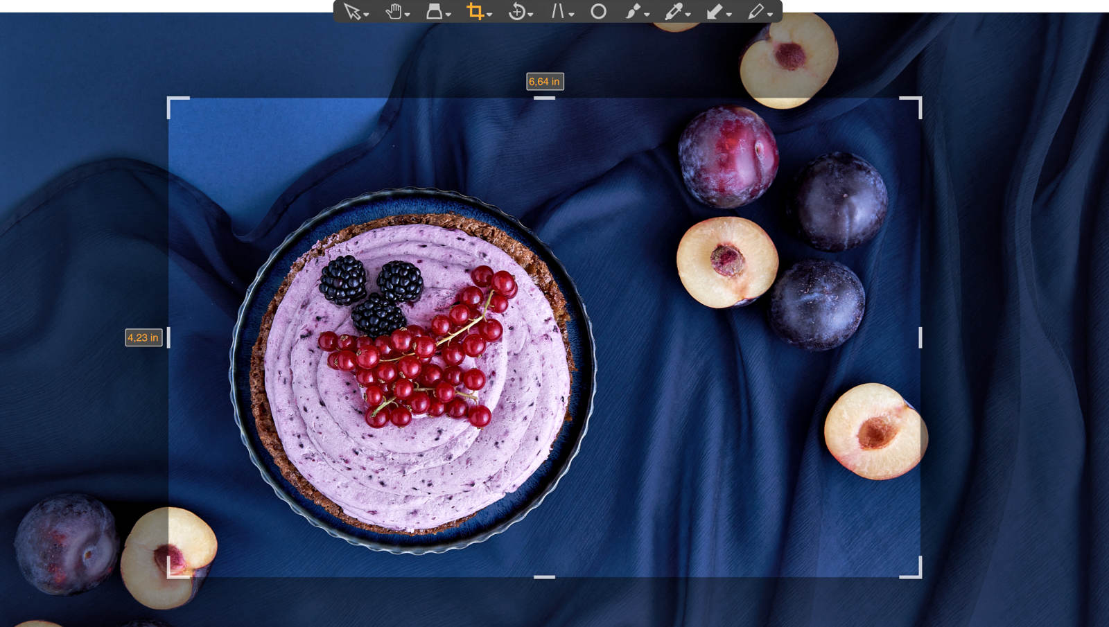 Zuschneidetool. Dank der gut sichtbaren Griffe im neuen Zuschneidetool können Sie Bildausschnitte leichter festlegen und transformieren. Schneiden Sie sofort von der Mitte aus zu, drehen Sie den Ausschnitt oder legen Sie ein bestimmtes Seitenverhältnis mit den Modifikatortasten fest.