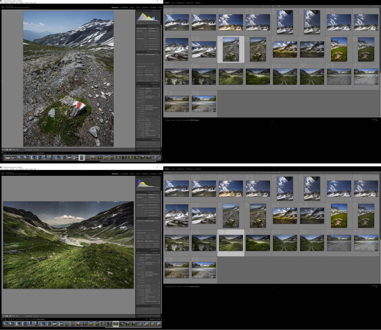 Unter Lightroom sieht die Sache ganz wenig anders aus. Auch hier wird das zu bearbeitende Bild auf den quadratischen Monitor gelegt. LR hat, anders als C1, die Leiste mit den Werkzeugen neben das zu bearbeitende Bild gelegt. Vorteil dabei ist, dass nun die ganze Leiste auf dem quadratischen Monitor sichtbar ist und damit jegliches, oft nerviges Scrollen entfällt. Das bringt es auch mit sich, dass das Querformatfoto für einmal proportional kleiner dargestellt wird als das Hochformat. Zur Not lässt sich die Werkzeugleiste aber einklappen, dann stimmt das Verhältnis der beiden Formate wieder.