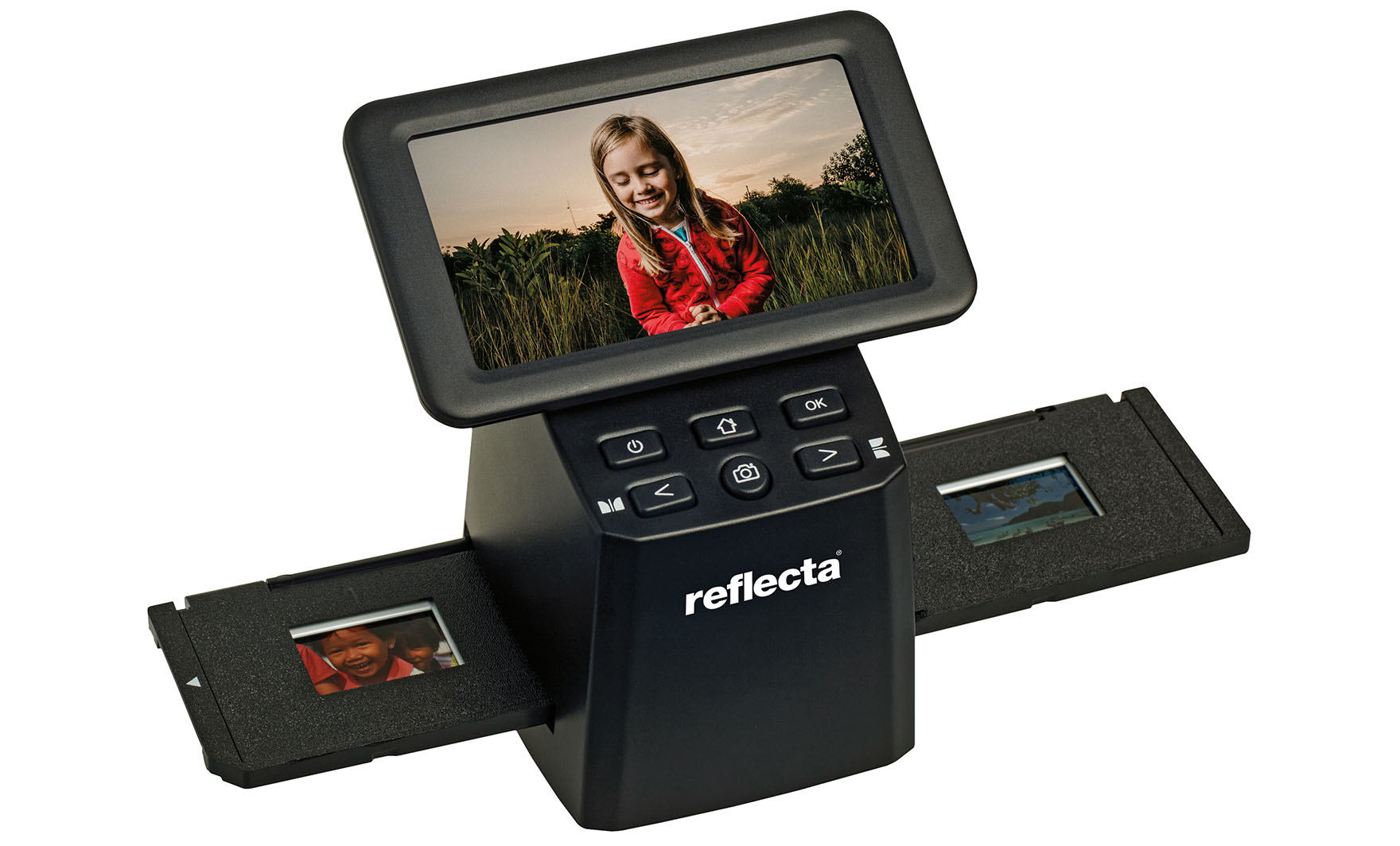Die bei beiden Geräte beiliegenden Halter ermöglichen das Scannen von vier gerahmten Dias mit einer Dicke von bis zu 3,2 mm sowie von 35mm- Filmstreifen mit bis zu sechs Bildern. Die Halter sorgen für eine optimale Planlage der Vorlagen und einen schonenden Umgang mit dem Filmmaterial. Sobald Dias oder Negativstreifen mit Hilfe der Halter in den Scanner eingeschoben werden, können sie sofort auf dem Display betrachtet und ausgewählt werden, wobei Negative selbstverständlich direkt als positiv dargestellt werden. Durch einen einzigen Knopfdruck lassen sich die Bilder als JPEG-Datei geradewegs auf einer SD-Karte mit bis zu 128GB abspeichern. Über die integrierte USB-2.0-Schnittstelle ist es auch möglich, die fertigen Scans auf einen Computer zu übertragen.
