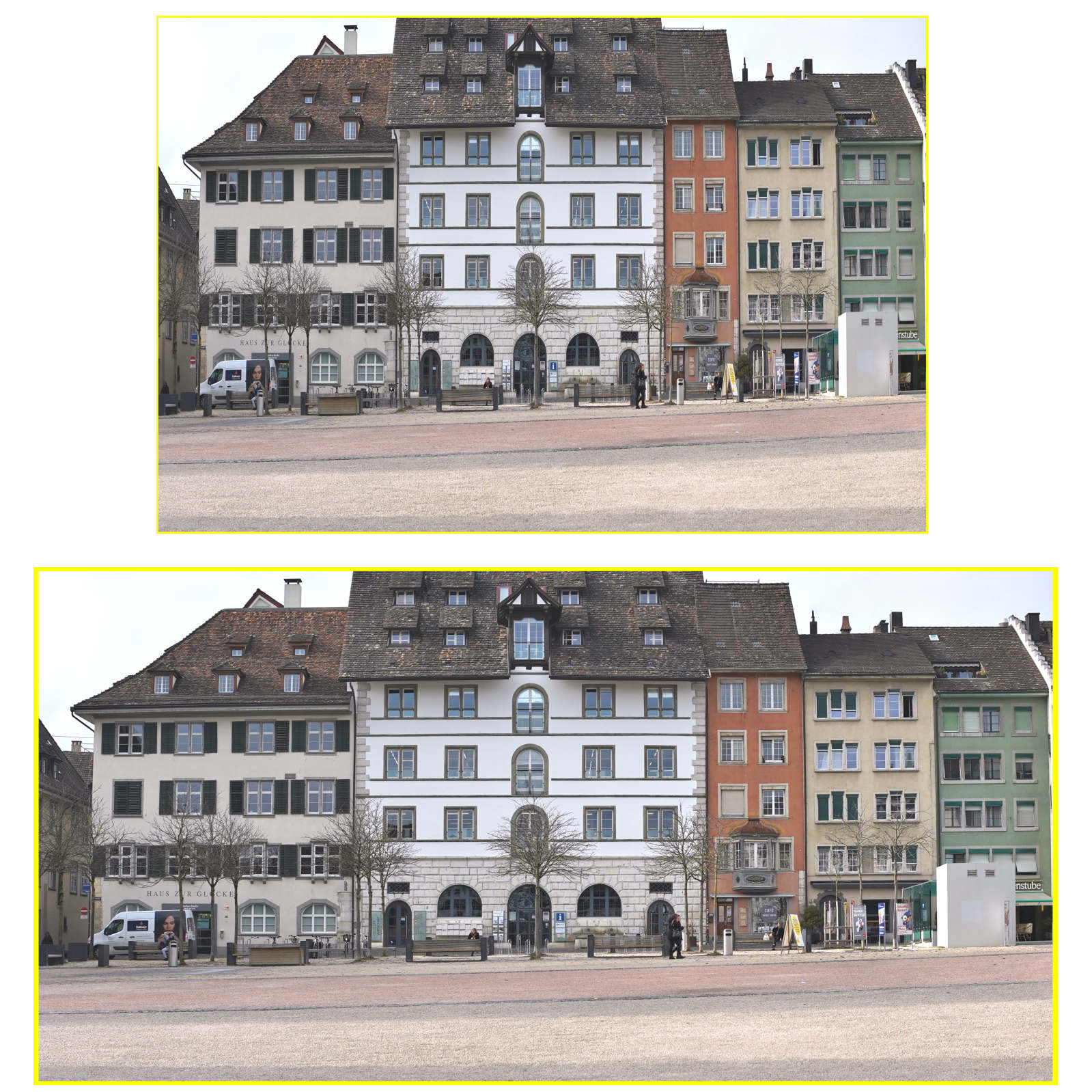 Der anamorphe Bildeffekt: Das Bild wird seitlich gestaucht aufgenommen (Bild oben) und in der Nachbearbeitung wieder auf das Seitenverhältnis 2,4:1 aufgeweitet (Foto: Urs Tillmanns, Fotointern.ch)