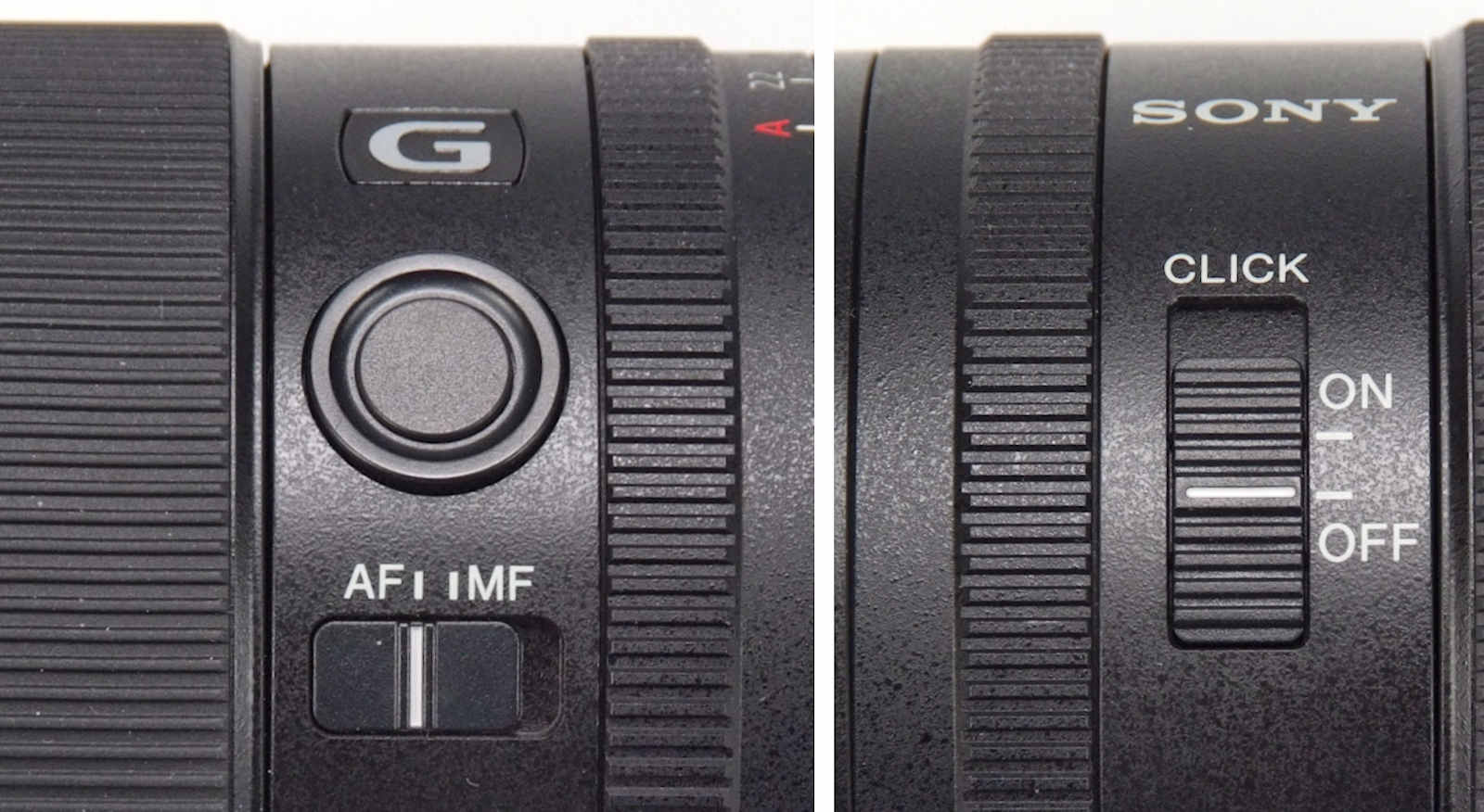 Bedienungselemente am Objektiv: Links die Fokus-Feststelltaste und den Fokusumschalter, rechts der Schalter für die Blendenrastung
