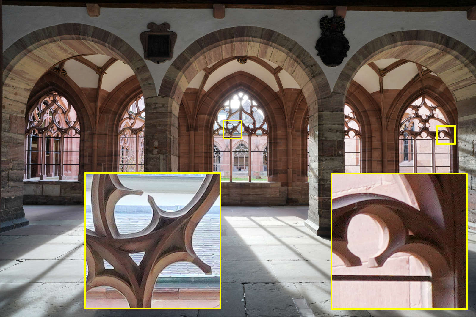 Der Kreuzgang des Basler Münsters. Auch hohe Kontraste werden bei offener Blende sehr gut bewältigt.